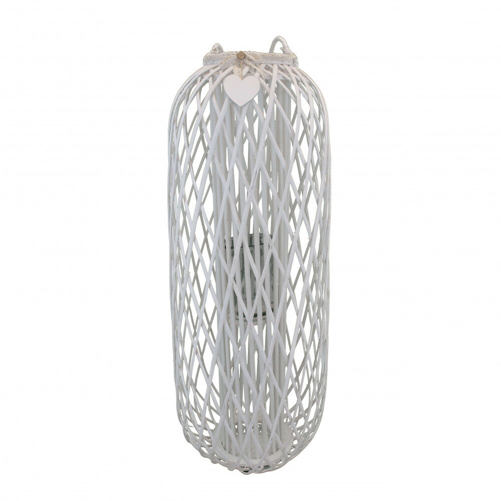 BIJELI lanterna od pruća i stakla s čipkastom vrpcom i ukrasom u obliku srca Dimenzije: cm Gornja Ø 22 x 115 h-Središnja Ø 44 x 115 h-Staklo Ø 15 x 21 h