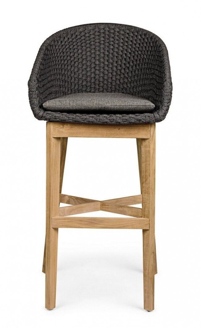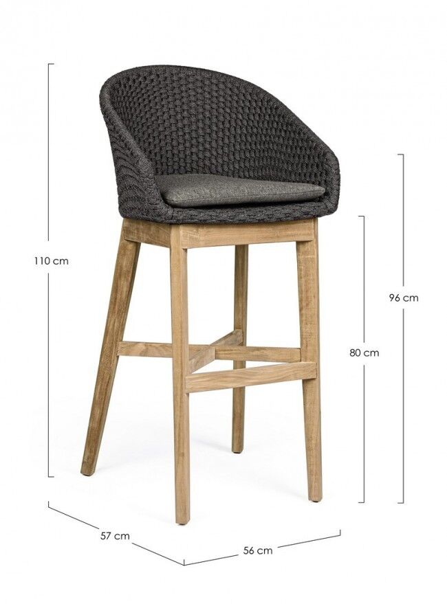 Elegantna Coachella barska stolica antracitne boje s aluminijskom konstrukcijom i pletenicom od olefinskog užeta. Udoban odvojivi jastuk s vodootpornom navlakom. Noge od certificiranog tikovine - svlk. Dimenzije: širina 56 cm, dubina 57 cm, visina 110 cm.