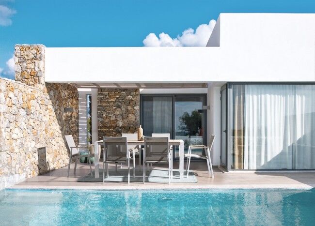 - Aluminij s premazom u prahu (poliester) : Stolica ima aluminijsku strukturu presvučenu premazom u prahu od poliestera , koji osigurava otpornost na hrđanje i vremenske uvjete, dok zadržava moderan i elegantan izgled u bijeloj boji.