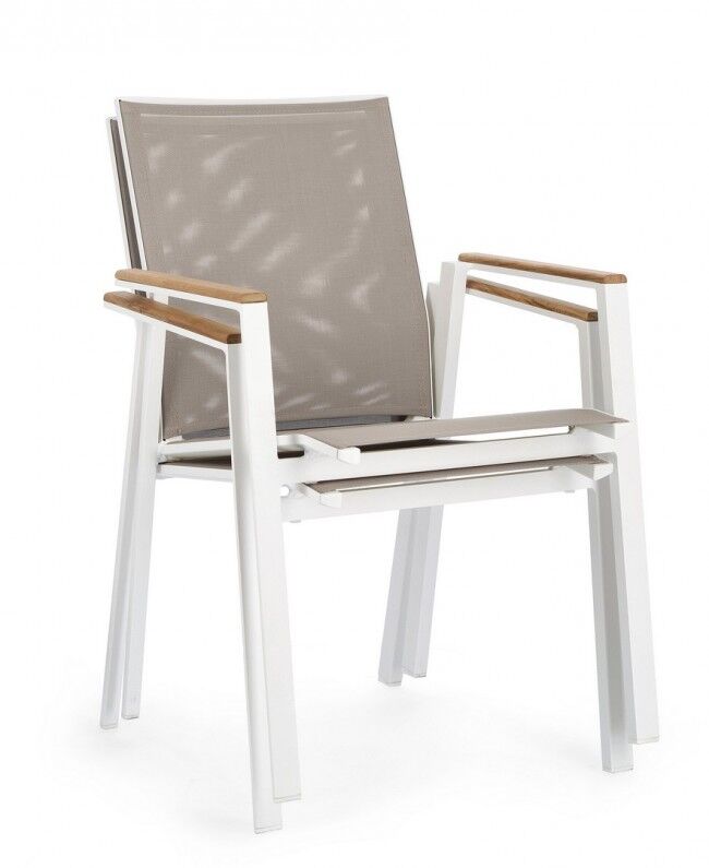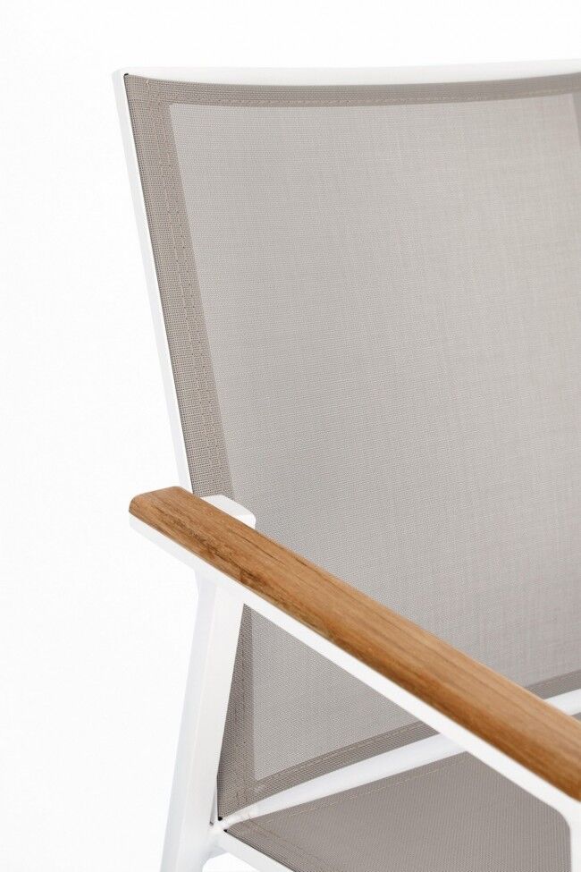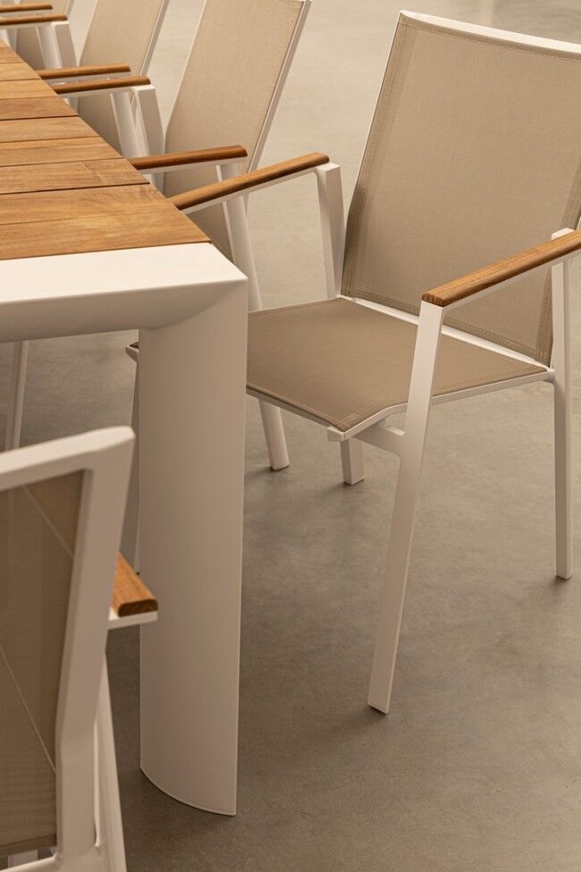 - Stil : Moderna stolica u bijeloj boji s umetcima od prirodnog tikovine koja se savršeno uklapa u moderne vanjske prostore, bilo na terasi, vrtu ili balkonu.