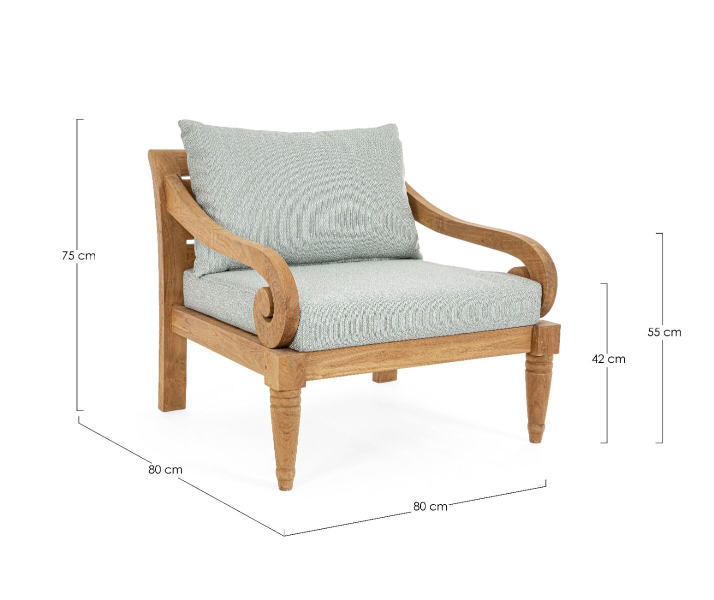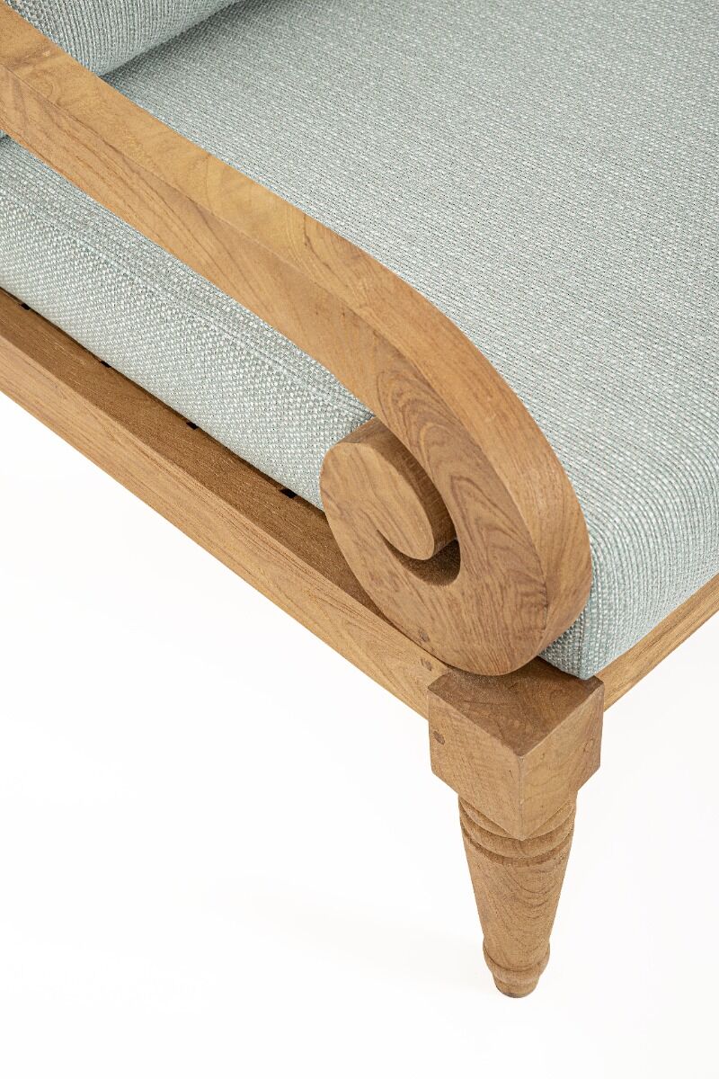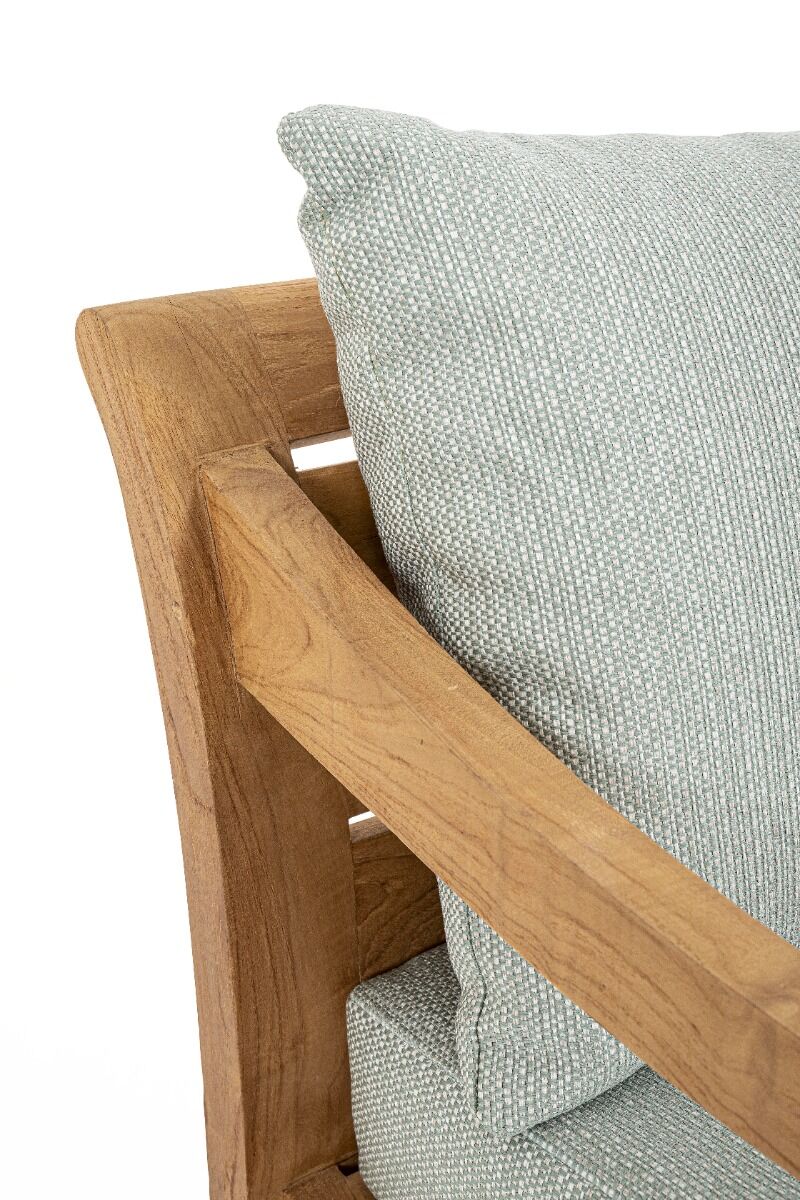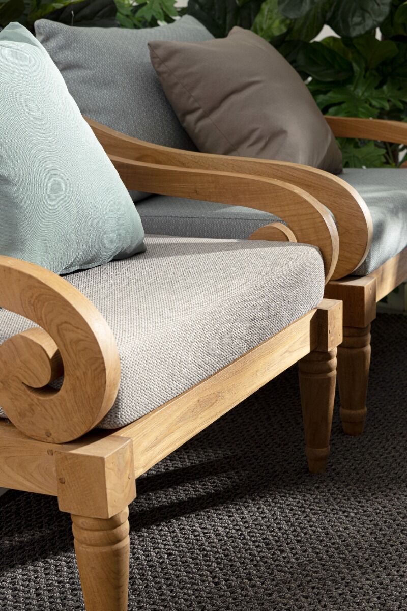 Drvena fotelja KARUBA AQUA izrađena je od 100% certificiranog tikovine (FSC), što osigurava održivost i ekološki prihvatljiv izbor. Fotelja ima prirodni rustikalni završetak koji ističe jedinstvene karakteristike tikovine, poput prirodnih pukotina i drvenih klinova koji svaki komad čine jedinstvenim. Udobni uklonjivi jastuci izrađeni su od kvalitetne olefinske tkanine otporne na sunce, otporne na vremenske uvjete i izvrsne za dugotrajnu upotrebu. Zbog prirodnih ulja u tikovini, na jastucima se s vremenom mogu pojaviti mrlje, što je prirodni proces starenja drva. Ova fotelja je prikladna za unutarnje prostore ili natkrivene vanjske prostore.