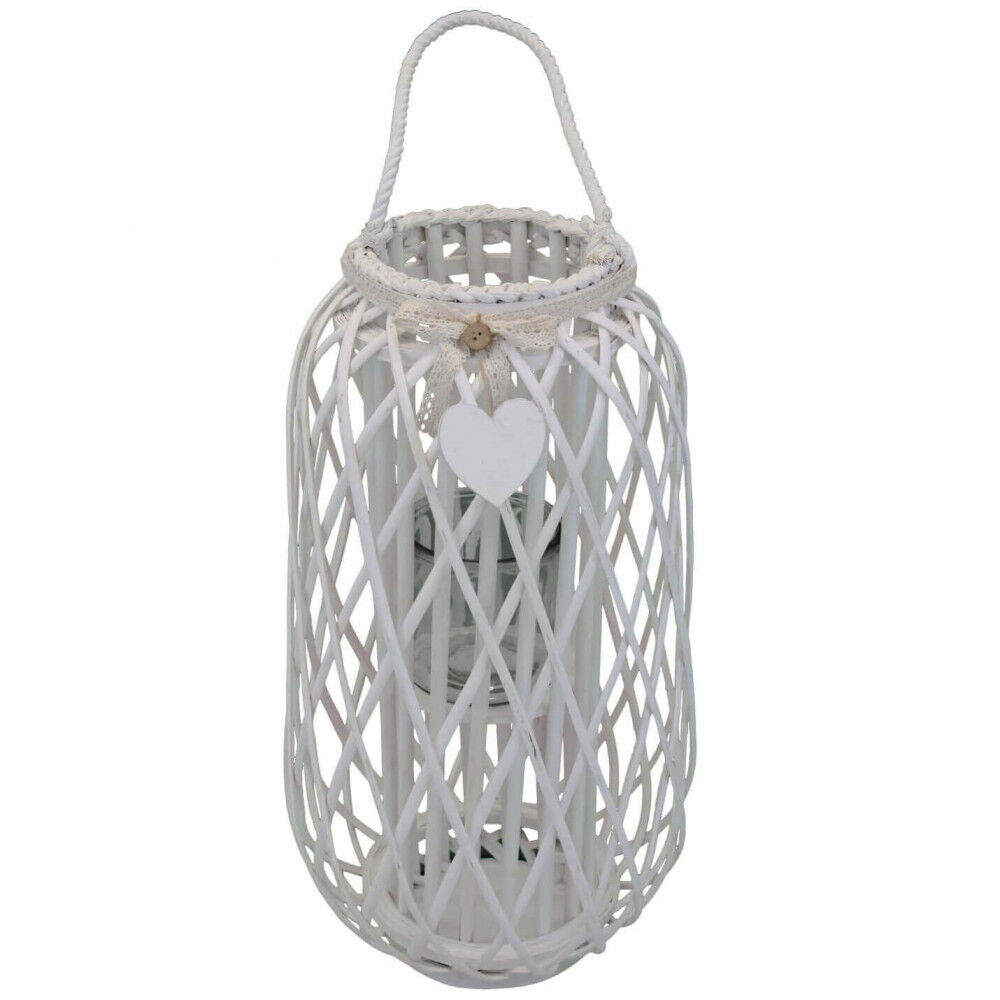 BIJELI lanterna od pruća i stakla s čipkastom vrpcom i ukrasom u obliku srca Dimenzije: cm Vrh Ø 18 x 66 h-Središnji Ø 31 x 66 h-Staklo Ø 13 x 17 h