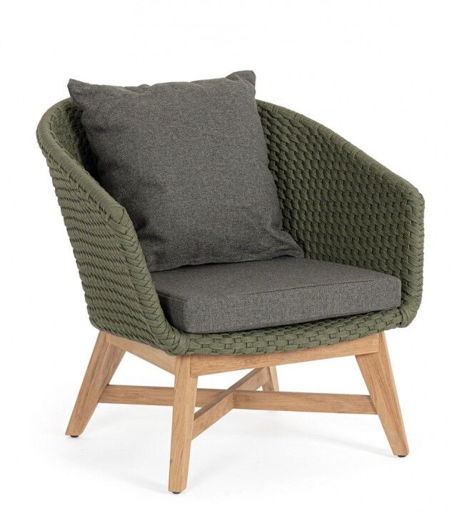 Elegantna Coachella zelena fotelja s aluminijskom konstrukcijom i pletenicom od olefinskog užeta. Udobni jastuci s vodootpornom navlakom. Noge od certificiranog tikovine - svlk. Dimenzije: širina 76 cm, dubina 78 cm, visina 77 cm.