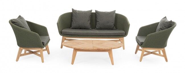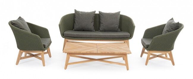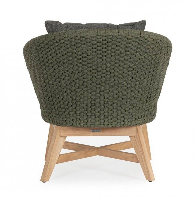 Coachella fotelja zelena je elegantan i moderan komad namještaja s aluminijskom konstrukcijom tretiranom praškastim premazom (poliester). Ima pletenicu od olefinskog užeta (100% polipropilen) i udobne jastuke na sjedalu i naslonu koji se mogu ukloniti i presvučeni su vodootpornom tkaninom Sunproof olefin (100% polipropilen). Noge su izrađene od tikovine - svlk (certificirano drvo iz održivih šuma) i potrebno ih je sastaviti. Svi vijci su izrađeni od pocinčanog čelika.