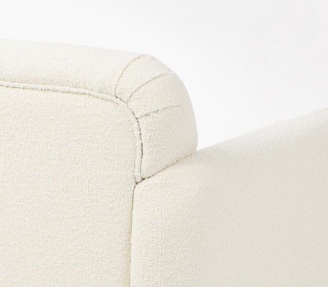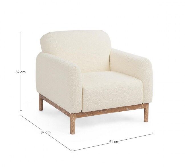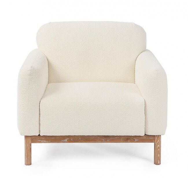 Fotelja DETROIT PRIRODNI BOUCLÉ: Elegantna fotelja s drvenom strukturom od jasena, presvučena poliesterskom bouclé tkaninom. Udobno sjedalo i naslon s poliuretanskom pjenom visoke gustoće. Noge je potrebno sastaviti. Idealna za dnevne sobe i druge unutarnje prostore.