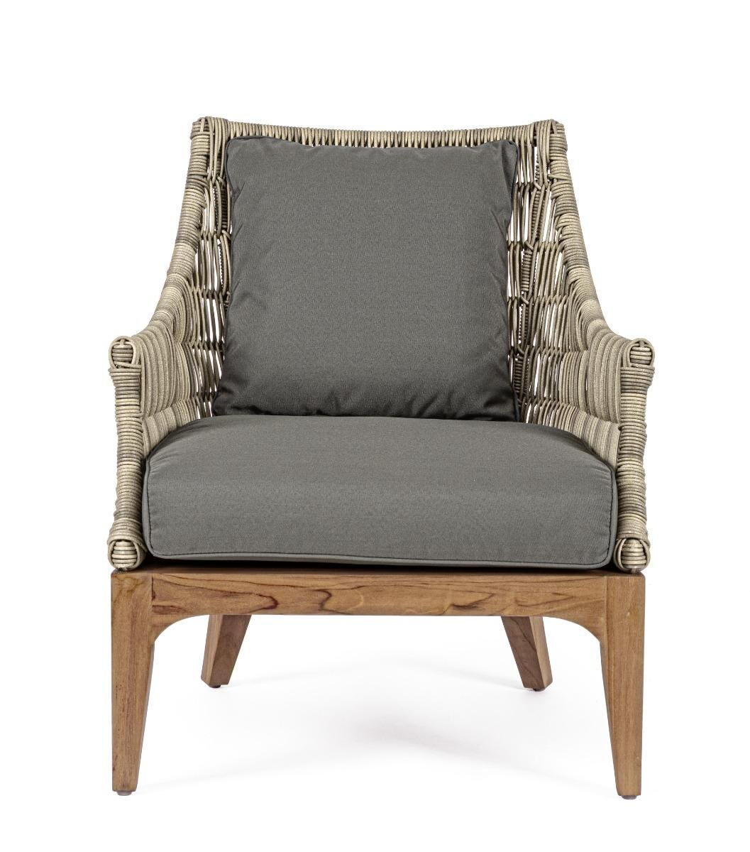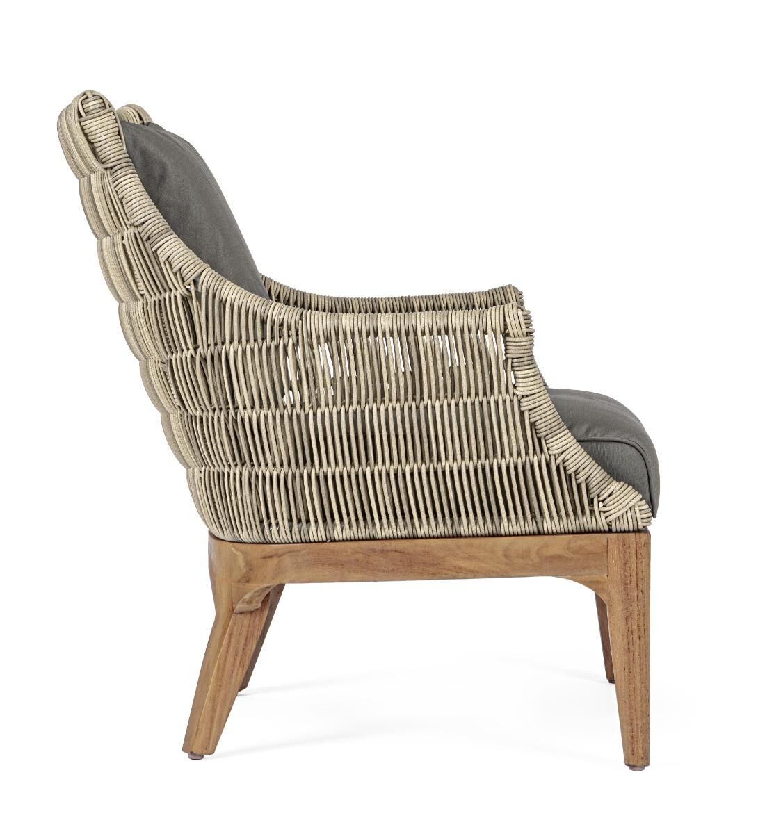 Intreccio za vanjsku upotrebu: Fotelja je opremljena pletenim uzorkom od sintetičkih vlakana debljine 5 mm, što je čini pogodnom za vanjsku upotrebu. Sintetička vlakna su obično izdržljiva i otporna na vremenske uvjete.