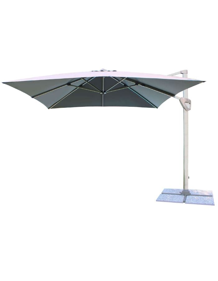 Ogrodje iz aluminija v sivi barvi. Drog 58 x 88 in 40 x 25 mm. 8 aluminijastih reber 14 x 24 mm. Železni križni podstavek za 4 betonske plošče velikosti 50 x 50 cm. Platno 250 gr/m2 iz poliestrske tkanine v sivi barvi, odporno proti vetru in drugim vremenskim vplivom. Senčnik se enostavno odpre in zapre z ročico. Možnost regulacije naklona po želji z ročico na drogu. Pri pritisku stopalke z nogo na dnu se senčnik lahko zavrti okoli svoje osi za 360°.
