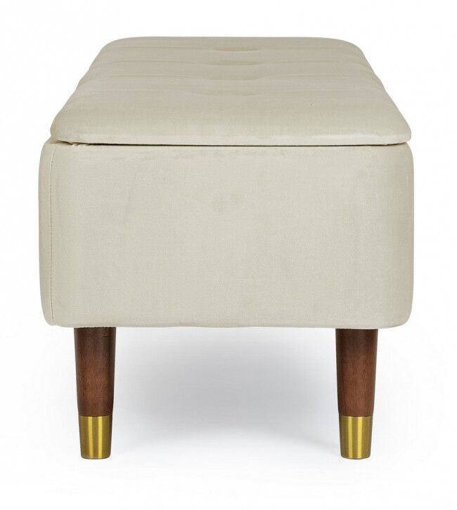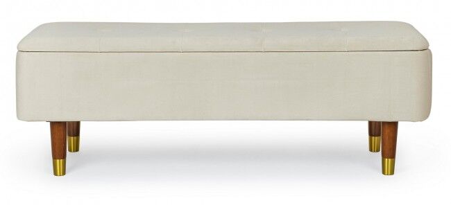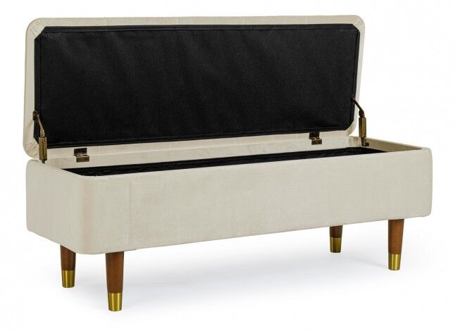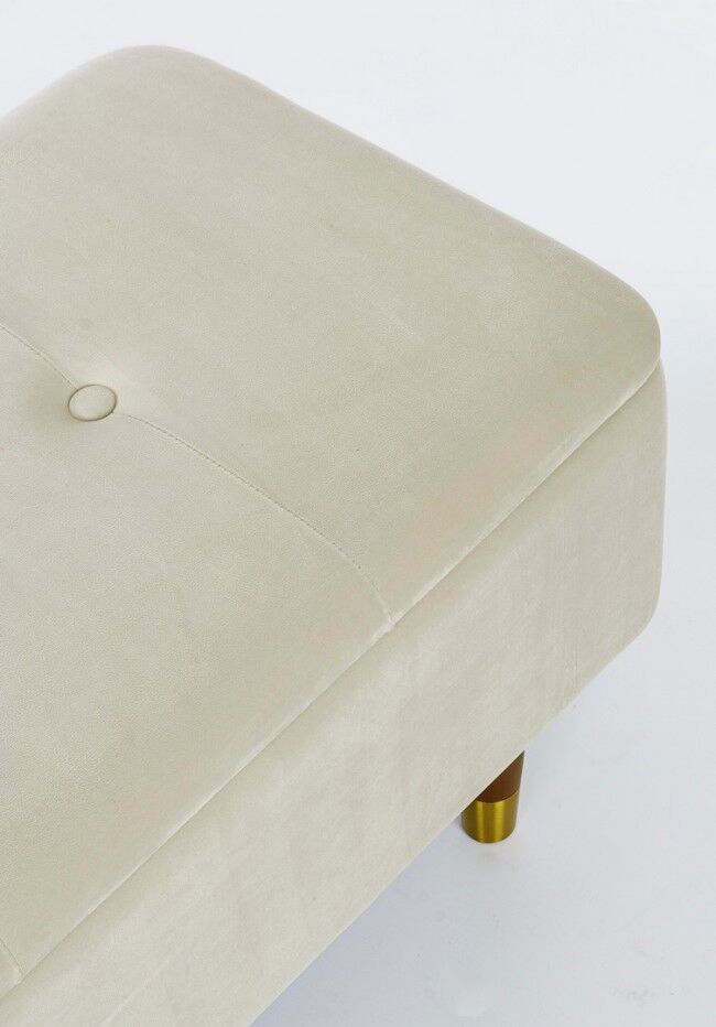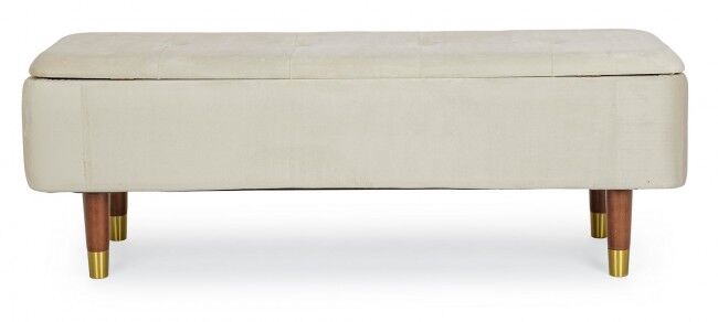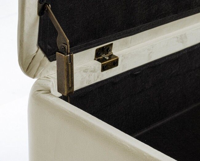Klupa sa prostorom za odlaganje KIRA natural je elegantan i funkcionalan komad namještaja koji ćete poželjeti imati u svom domu. Ispod su točne značajke proizvoda: - **Struktura**: Izrađen od MDF-a i šperploče, što osigurava snagu i izdržljivost. - **Noge**: Izrađene od izdržljivog gumenog drva, što pridonosi stabilnosti proizvoda. Krajevi nogu izrađeni su od zlatno lakiranog čelika, što proizvodu daje dašak prestiža. - **Presvlaka**: Presvlaka je izrađena od poliestera s efektom baršuna, koji je ugodan na dodir i daje elegantan izgled. - **Montaža**: Noge je potrebno sastaviti radi lakšeg transporta i skladištenja. Ovaj kontejner za klupe izvrstan je izbor za svaki prostor jer spaja estetiku i funkcionalnost, unoseći sofisticiranost i praktičnost u vaš dom.