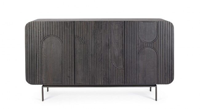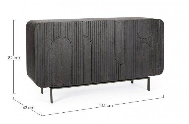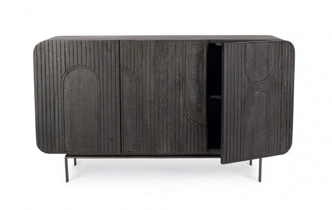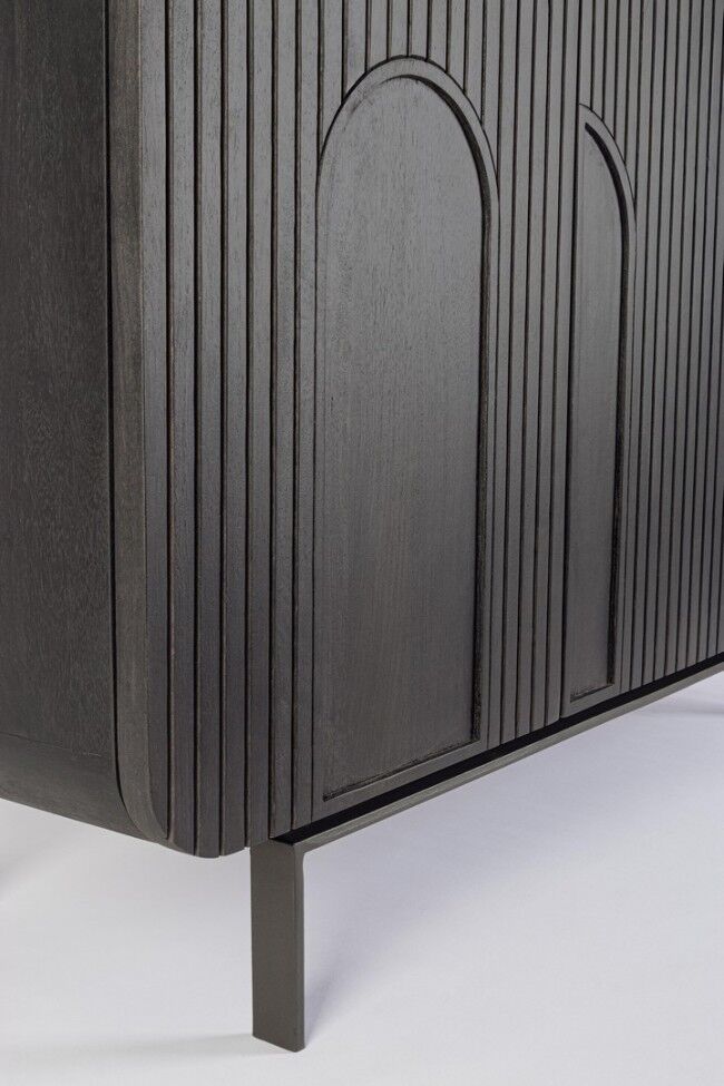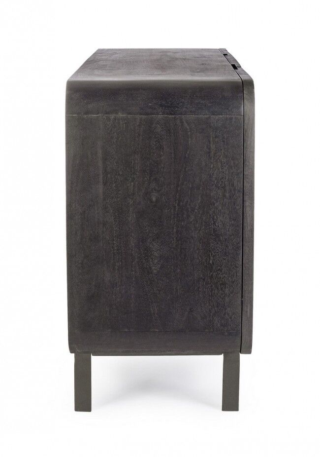 Komoda 3A ORISSA CRNA je unikatan i moderan komad namještaja izrađen od drva manga koji svakom prostoru unosi prirodnu ljepotu i toplinu. Crno lakirana površina naglašava eleganciju i omogućuje jednostavno prilagođavanje različitim stilovima uređenja interijera. Stražnja strana od MDF-a pruža dodatnu stabilnost, dok čelične noge obložene prahom pružaju moderan i čvrst završetak. Komoda uključuje praktične police za organizirano skladištenje.