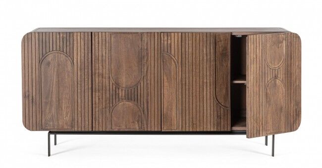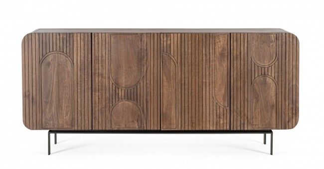 Komoda ORISSA donosi sofisticiranost i dašak prirode u vaš dom. Izrađen je od izdržljivog drva manga s poleđinom od MDF-a, što osigurava stabilnost i dugovječnost. Površina je obrađena bojom na bazi vode koja naglašava prirodnu teksturu drva. Čelične noge obložene prahom daju moderan dodir i pružaju čvrstu potporu. Komoda uključuje četvera vrata s prostranim policama za organizirano skladištenje. Idealan je izbor za moderan i funkcionalan dodatak interijeru.