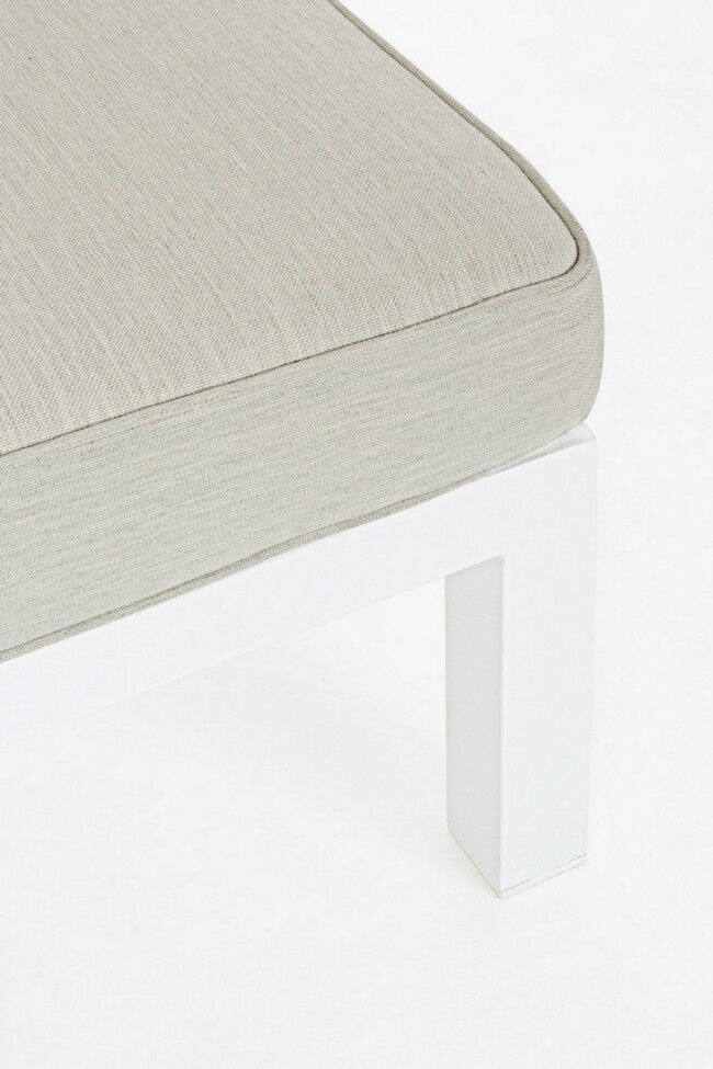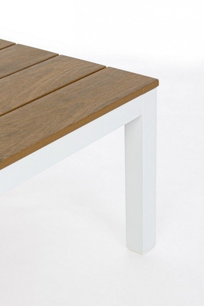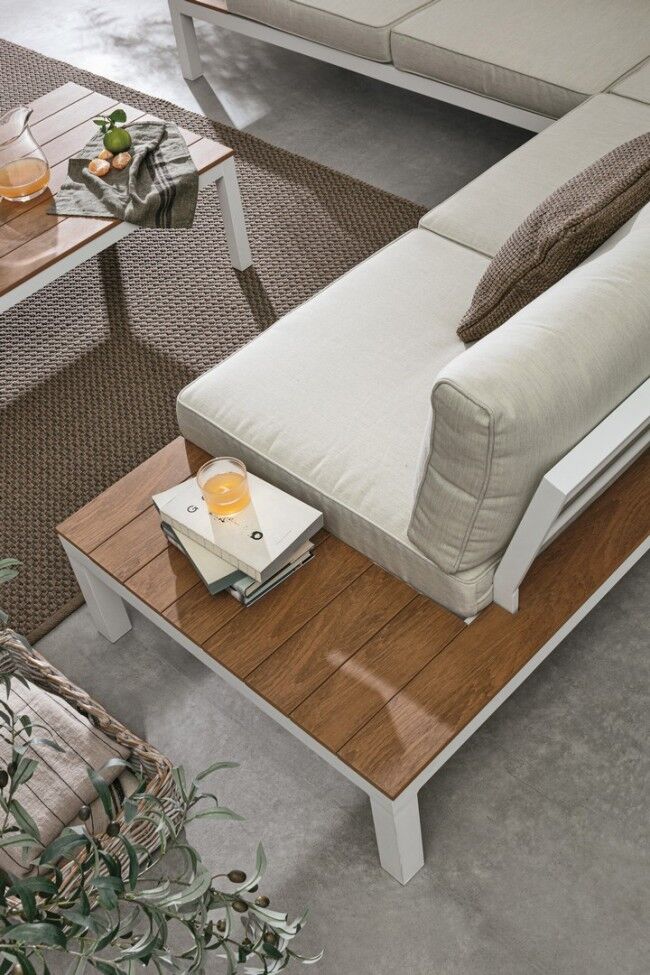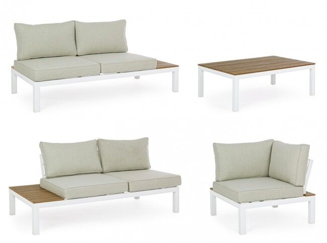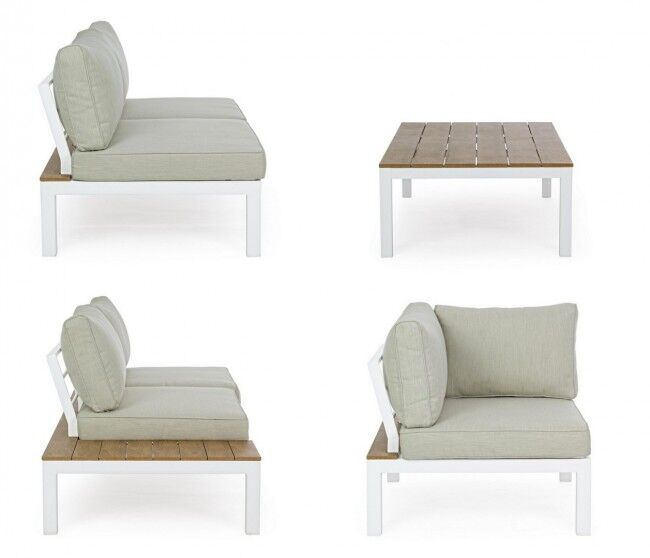 Opis: Kutna vrtna garnitura ELIAS bijela SJ60 je moderan i elegantan namještaj dizajniran za udobno sjedenje na otvorenom. Izrađen je od izdržljivog aluminija, praškasto presvučen poliesterom koji pruža dodatnu otpornost na vremenske utjecaje. Bočne i gornja strana stola izrađena su od materijala Polywood, kompozitne tvari koja imitira izgled drva (90% polistiren, 10% SBS) u boji tikovine. Set uključuje uklonjive jastuke od poliesterske tkanine za jednostavno čišćenje. Svi vijci izrađeni su od pocinčanog čelika, što osigurava dodatnu izdržljivost. Set se mora sastaviti.
