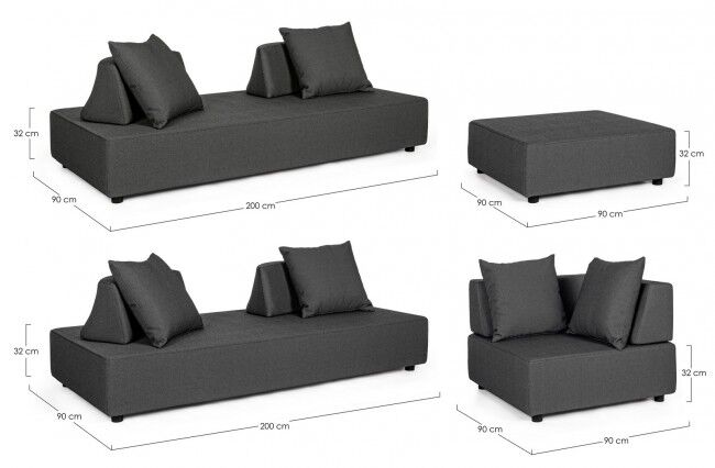 - Kutni naslon: 90 cm (duljina) x 90 cm (širina) x 32 cm (visina)