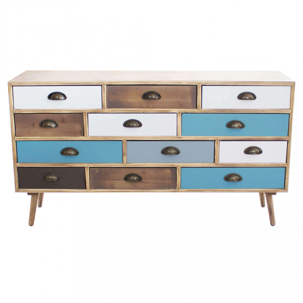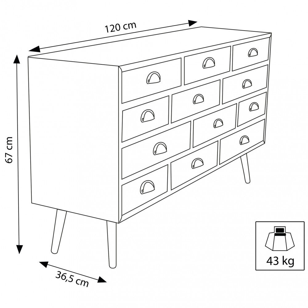 MDF konstrukcija, noge od borovine, gornja ploča NATURAL boje 12 ladica u boji Dimenzije: 120 x 36,5 x 67 h cm