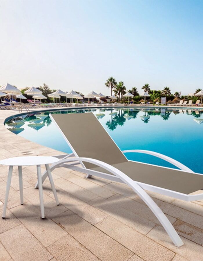 Ležaljka, aluminijski okvir obojen praškastom poliesterskom bojom, PVC platno dvostruko prošiveno. Naslon za leđa u 5 položaja. Vrlo udobna ležaljka za terase, balkone, saune, uz bazen i za plažu.