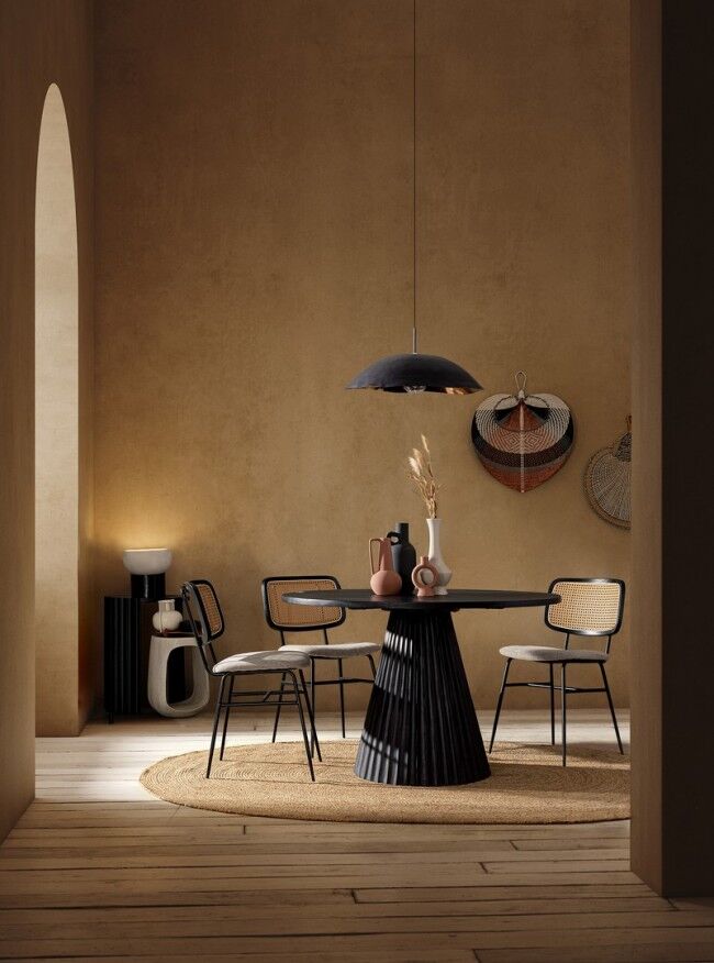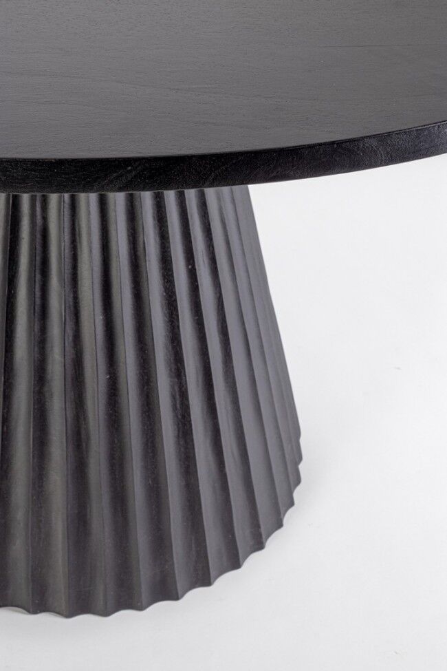 Blagovaonski stol ORISSA okruglog oblika promjera 120 cm elegantan je i moderan izbor za sve koji cijene kvalitetan namještaj s unikatnim detaljima. Izrađen je od drva manga s tretmanom koji uključuje nitrocelulozni premaz u crnoj boji, što osigurava trajnost i elegantan izgled. Postolje s izrezbarenim detaljima dodaje dašak sofisticiranosti, a moderan dizajn omogućuje stolu savršeno pristajanje uz različita okruženja.