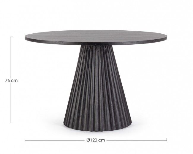 Okrugli blagovaonski stol ORISSA D120 crni je moderan stol od drveta manga za 6 osoba, promjera 120 cm i visine 76 cm. Profinjeni crni premaz od nitroceluloze i rezbareni detalji za elegantan ambijent.