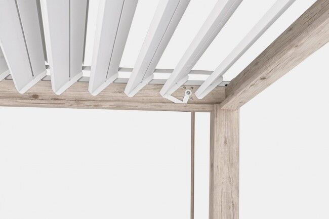 Pergola OCEAN 3,6x6 rustic-bijela je luksuzna i moderna vanjska pergola s aluminijskom konstrukcijom, premazanom prahom i presvučena PVC folijom s 3D efektom drveta za prirodan rustikalni izgled. Krov je opremljen s lamelama u dva segmenta, koje se neovisno upravljaju pomoću dvije ručke. Ugrađen je i sustav za odvodnju vode unutar stupova, a nehrđajući vijci jamče otpornost na vremenske uvjete.