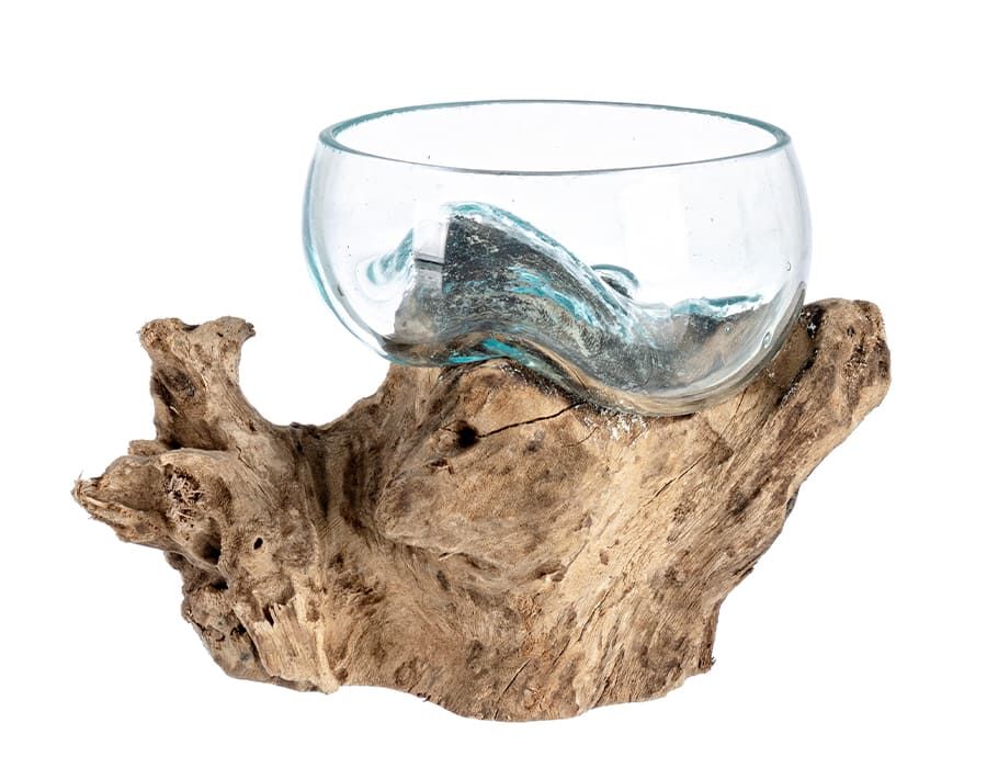 Prirodni korijen od tikovine/gamala s recikliranim staklom napuhanim izravno na korijen. Oblici i veličine koje stvaraju drvo i staklo samo su približni, svi se proizvodi razlikuju jedni od drugih. unikatni komadi.