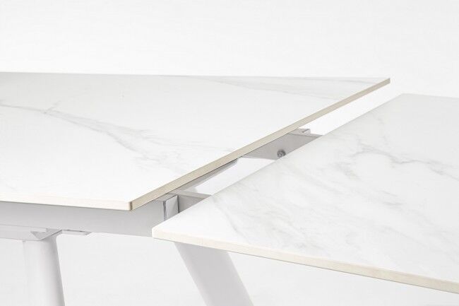 Produživi vrtni stol JARKKO 160–240x90 s keramičkom pločom u bijeloj boji i bijelom metalnom bazom. Pogodan za 6–10 osoba.