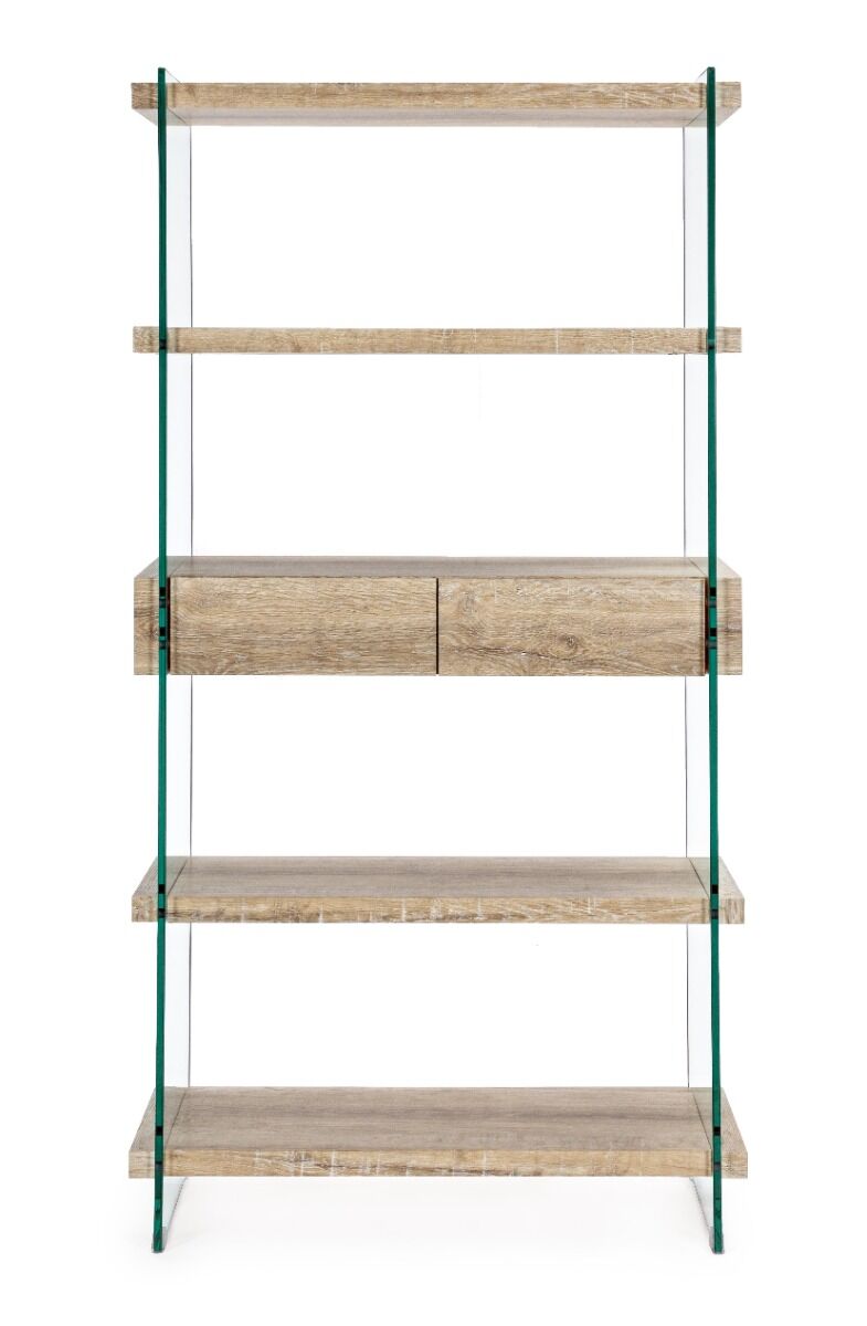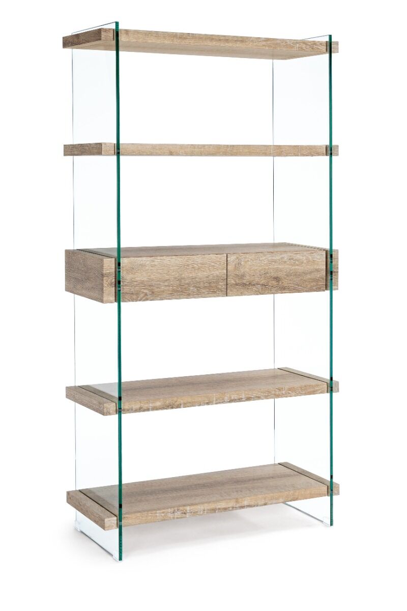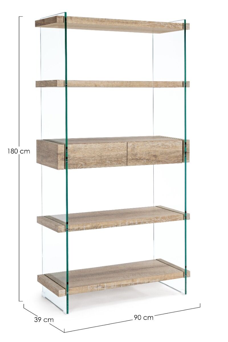 Knjigoteka LINE KENYA moderno je i elegantno rješenje za odlaganje knjiga i drugih ukrasnih predmeta. Vitrina ima četiri otvorene police i dvije ladice, izrađena od medijapana presvučena melaminskom folijom s efektom drveta, što prostoriji daje prirodan izgled i toplinu. Bočne stranice izrađene su od 12 mm kaljenog stakla koje ormariću daje dašak moderne elegancije i stvara osjećaj otvorenosti i lakoće. Svaka polica ima maksimalnu nosivost od 2 kg, što omogućuje sigurno skladištenje knjiga, ukrasnih predmeta ili drugih dodataka.
