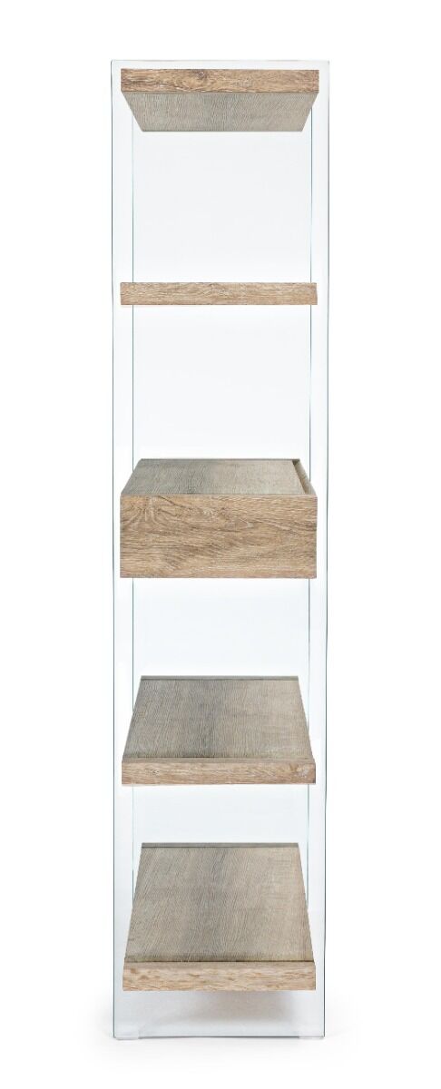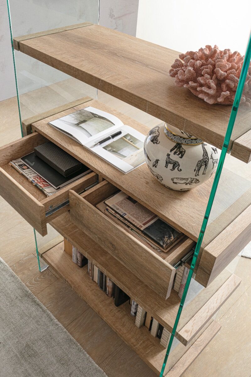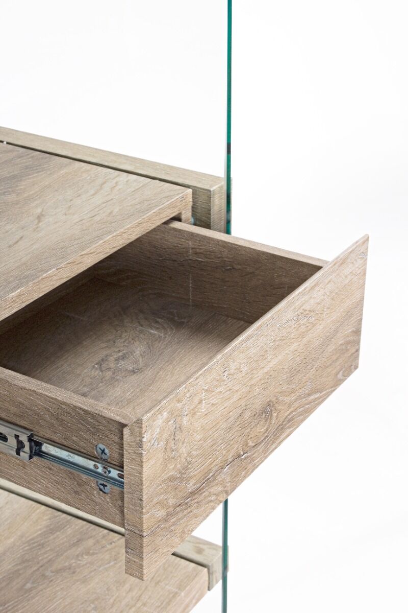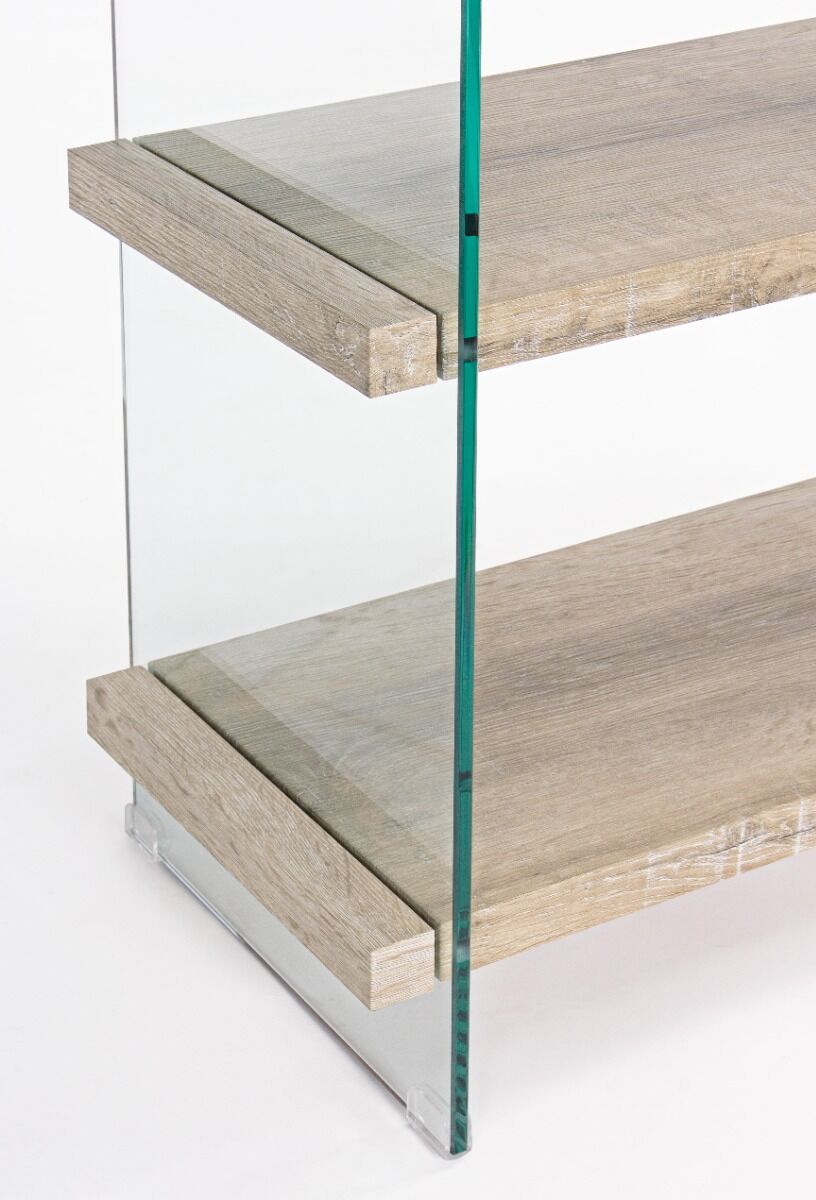 Knjigoteka LINE KENYA moderno je i elegantno rješenje za odlaganje knjiga i drugih ukrasnih predmeta. Vitrina ima četiri otvorene police i dvije ladice, izrađena od medijapana presvučena melaminskom folijom s efektom drveta, što prostoriji daje prirodan izgled i toplinu. Bočne stranice izrađene su od 12 mm kaljenog stakla koje ormariću daje dašak moderne elegancije i stvara osjećaj otvorenosti i lakoće. Svaka polica ima maksimalnu nosivost od 2 kg, što omogućuje sigurno skladištenje knjiga, ukrasnih predmeta ili drugih dodataka.