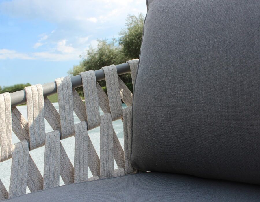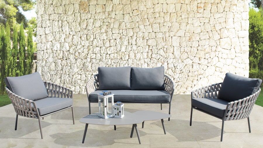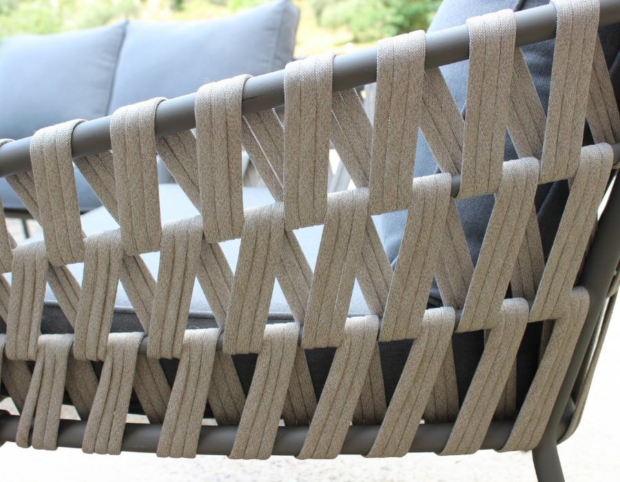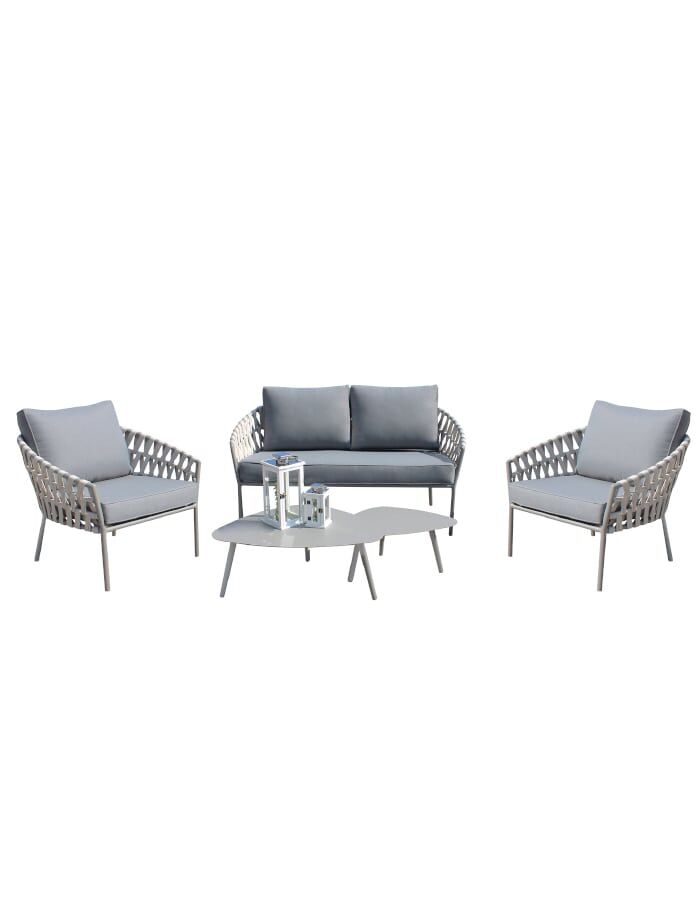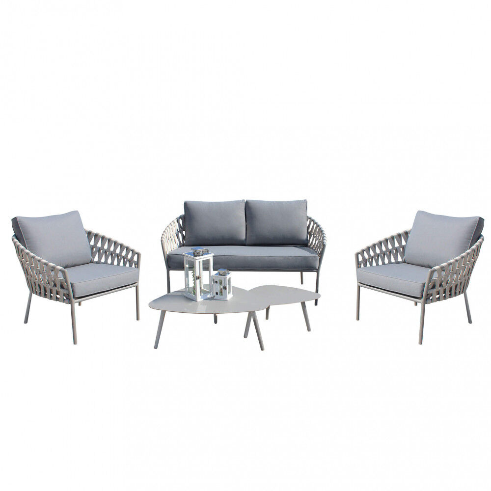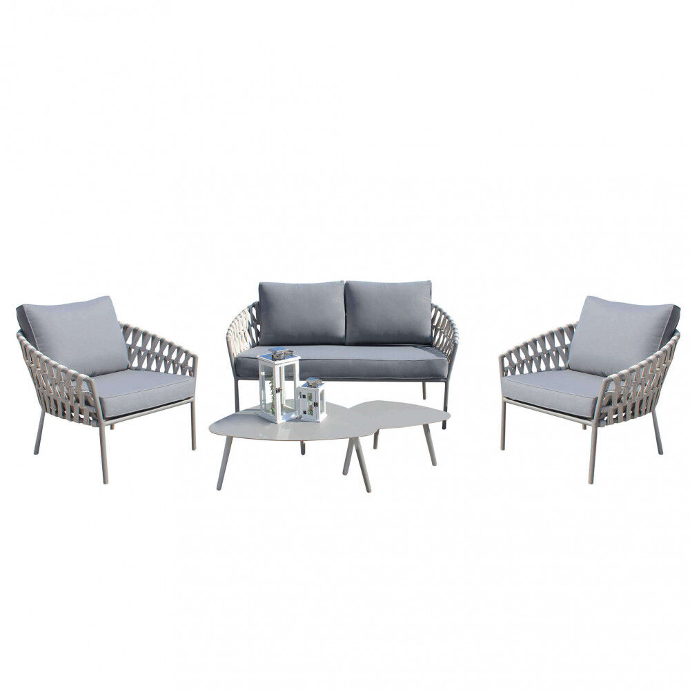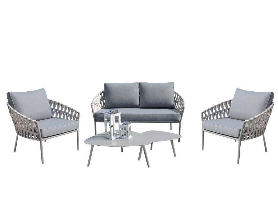 Ogrodje iz aluminija opleteno s ploščato vrvjo v sivi barvi z visoko zaščito proti UV žarkom. Blazine debeline 10 cm. V kompletu so 2 klubske mizice. Garnitura je primerna za posedanje na vrtu, terasi ali ob bazenu.
