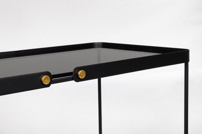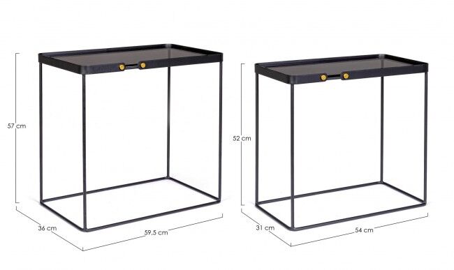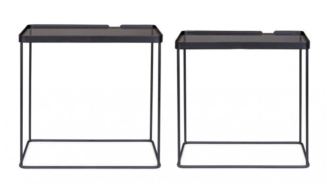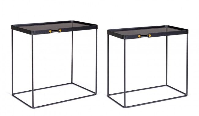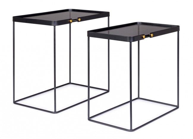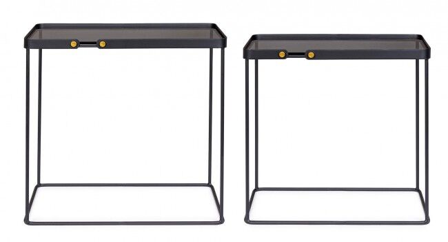 Set od 2 stolića ZEINA RETT J88 u crnoj boji s elegantnim čeličnim površinama i staklenim pločama. Sofisticirani dizajn koji spaja funkcionalnost i estetiku za vaš dom.