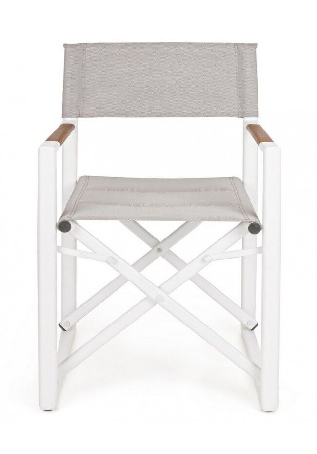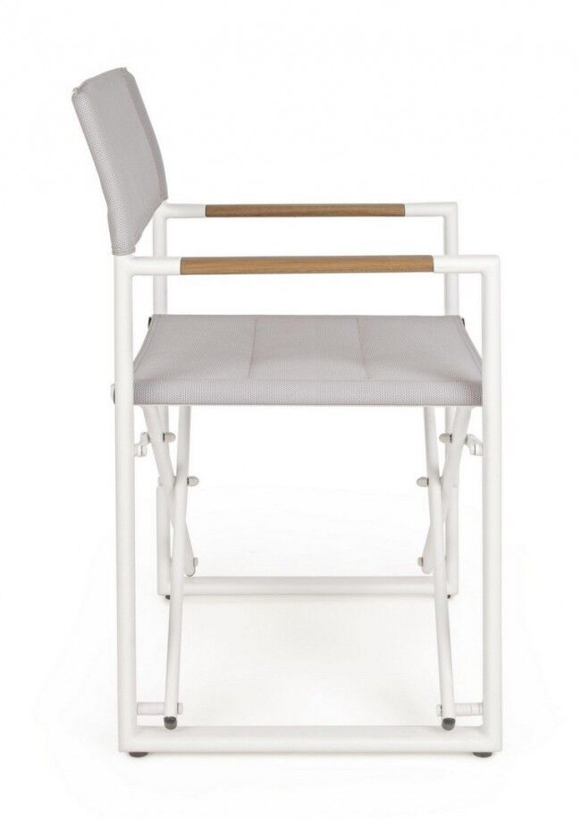 Sklopiva stolica REGISTA LAGUN bijele boje s aluminijskom konstrukcijom, tekstilnim sjedalom i ručkama s umetcima od tikovine. Lagan i sklopiv , pogodan za terase, vrtove ili balkone. Marka Bizzotto. Minimalna narudžba: 2 komada .
