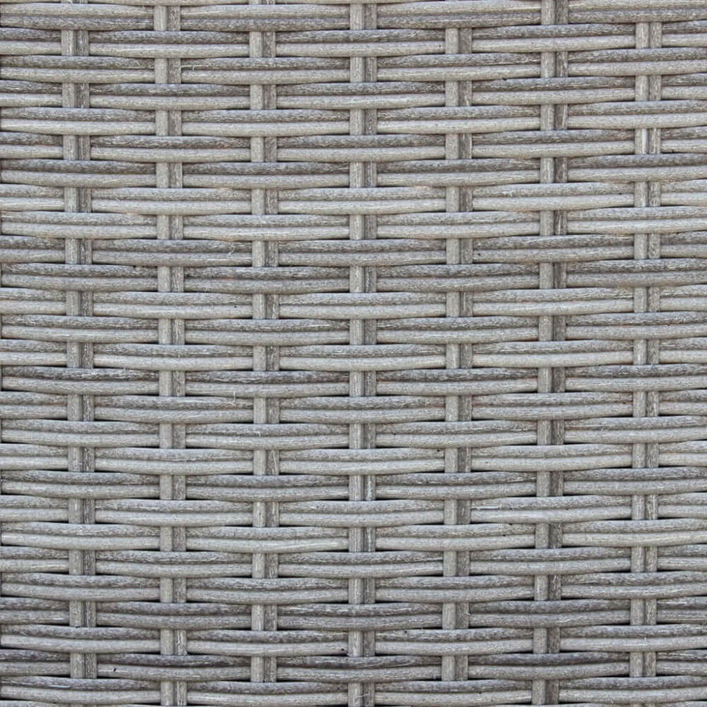 - Materijal : Garnitura je izrađena od visokokvalitetnog aluminijskog okvira, protkanog umjetnom tehno-ratan uzicom sive boje. Ova kombinacija materijala osigurava trajnost i otpornost na UV zrake, što omogućuje dugotrajnu vanjsku upotrebu.