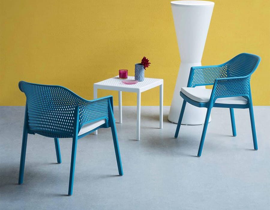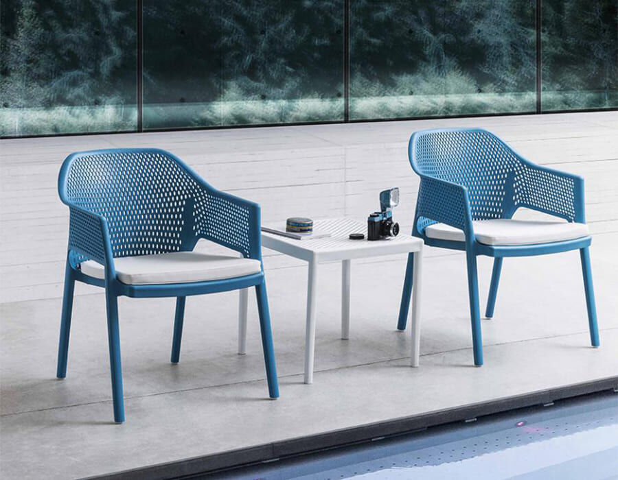Stolić od tehnopolimera pogodan za sjedenje i ispijanje kave pored Minush fotelja ili pored ležaljki, na terasi, uz bazen i na plaži.
