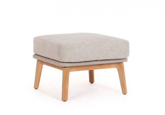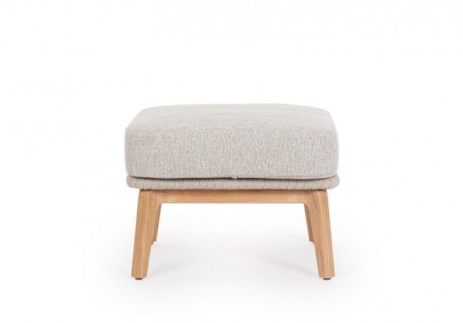 TAMIRES tabure otoman s bež jastukom kombinira elegantan dizajn i izdržljive materijale. Njegova aluminijska struktura, noge od tikovine, polipropilensko uže i vodootporni olefinski jastuk otporan na sunce idealni su za vanjske prostore. Dimenzije: 57,5x54,5x43 cm.