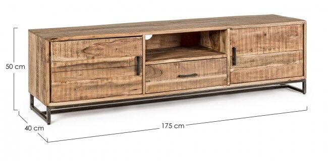 TV komoda 2A-1C ELMER je elegantan komad namještaja koji spaja funkcionalnost i estetski izgled. Svojim promišljenim karakteristikama dodatno će oplemeniti svaki životni prostor. **Značajke proizvoda:** - **Okvir**: Izrađen je od izdržljivog drva bagrema, što mu daje prirodan i topao izgled. Drvo bagrema poznato je po svojoj izdržljivosti i dugovječnosti. - **Naslon**: izrađen je od šperploče, što osigurava čvrstu i stabilnu osnovu. - **Noge**: Izrađene su od čelika premazanog epoksidnim prahom, koji osigurava visoku otpornost na ogrebotine i druga oštećenja te stalku daje moderan, industrijski izgled. - **Zaštitni premaz**: Površine su tretirane zaštitnim akrilnim završnim premazom koji dodatno štiti drvo i osigurava dugotrajan sjaj i jednostavno održavanje. TV stalak 2A-1C Elmer posebno je dizajniran za ugradnju modernih audio-vizualnih uređaja, a nudi i praktičan prostor za pohranu dodatne opreme. Njegova elegantna kombinacija materijala i modernog dizajna lako će se uklopiti u različite stilove opremanja unutarnjih prostora.