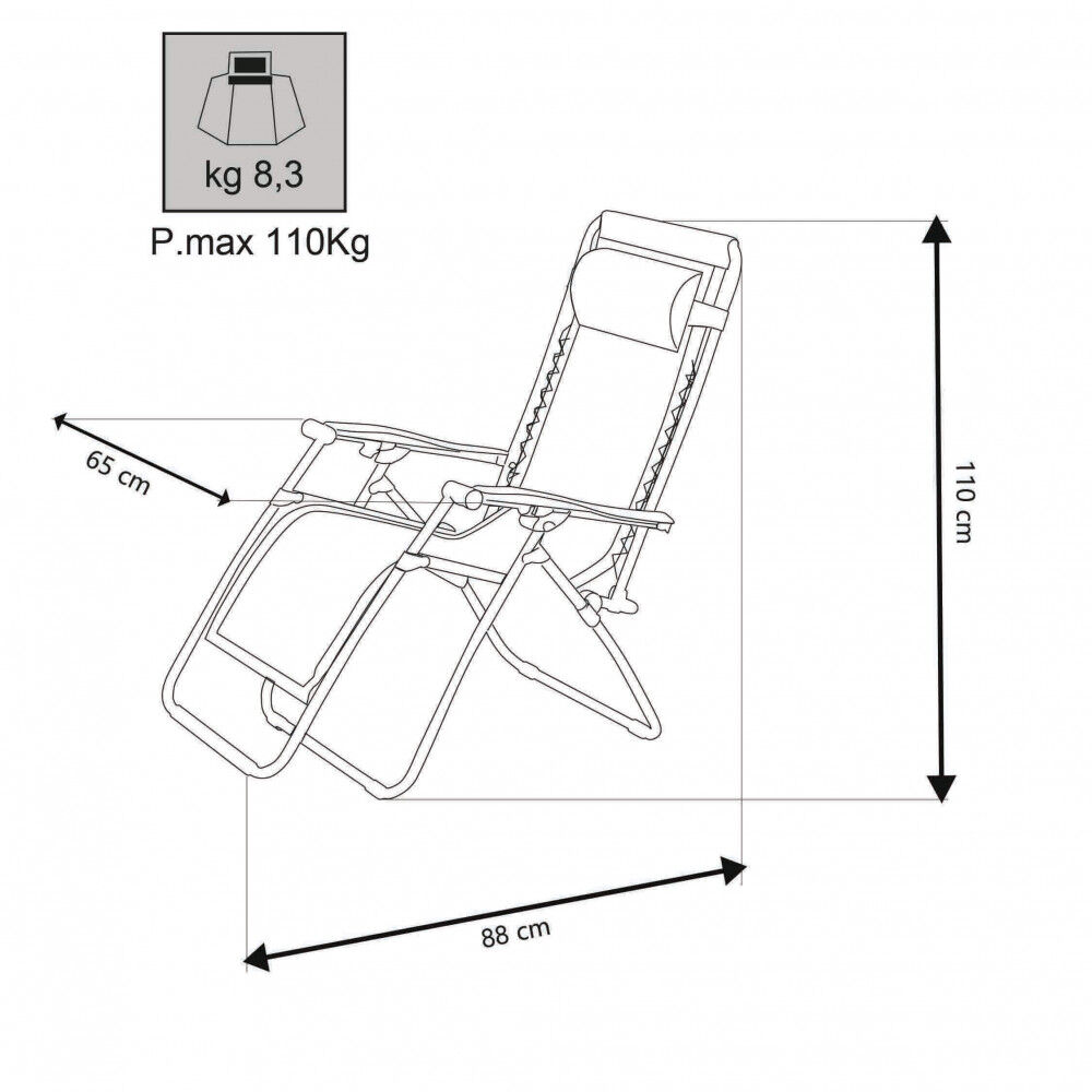 Dostupne BEŽ, PLAVA, SVIJETLO PLAVA, TAMNO SIVA, CRNA ili TAMNO ZELENA, ANTRACIT čelična konstrukcija Ø 22 x 1 mm, 2 x 1 tekstilna tkanina, maksimalna nosivost 110 kg. Dimenzije: 88 x 65 x 110 h cm