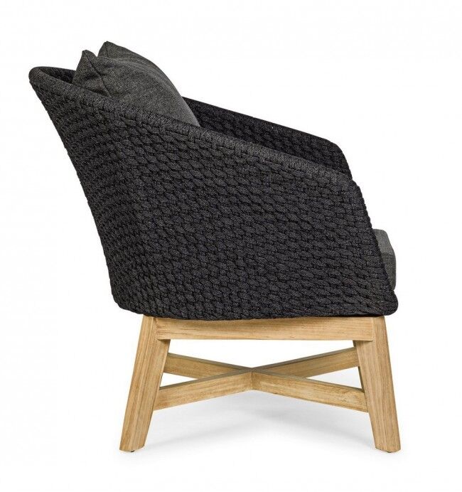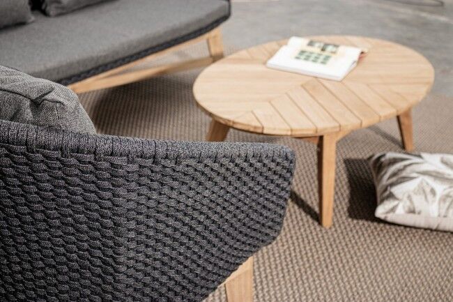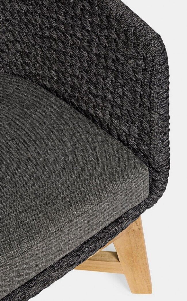 Vrtna fotelja Coachella u antracit boji savršen je izbor za udoban i moderan boravak na otvorenom. Stolica ima aluminijsku konstrukciju, bojanu prahom (poliester), što osigurava otpornost na vremenske utjecaje. Olefinsko tkanje užeta (100% polipropilen) dodaje moderan i sofisticiran izgled. Jastuk sjedala se može ukloniti i izrađen je od vodoodbojne tkanine Sunproof Olefin (100% polipropilen), što nudi iznimnu udobnost. Noge su izrađene od certificirane SVLK tikovine koja dolazi iz održivo gospodarenih šuma, dok su vijci izrađeni od pocinčanog čelika za veću izdržljivost. Noge je potrebno sastaviti.