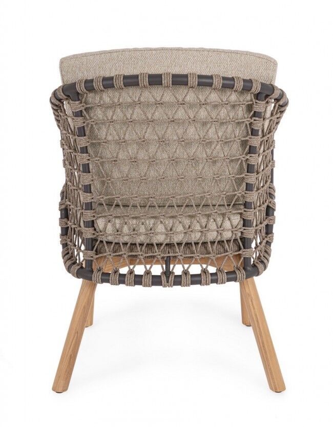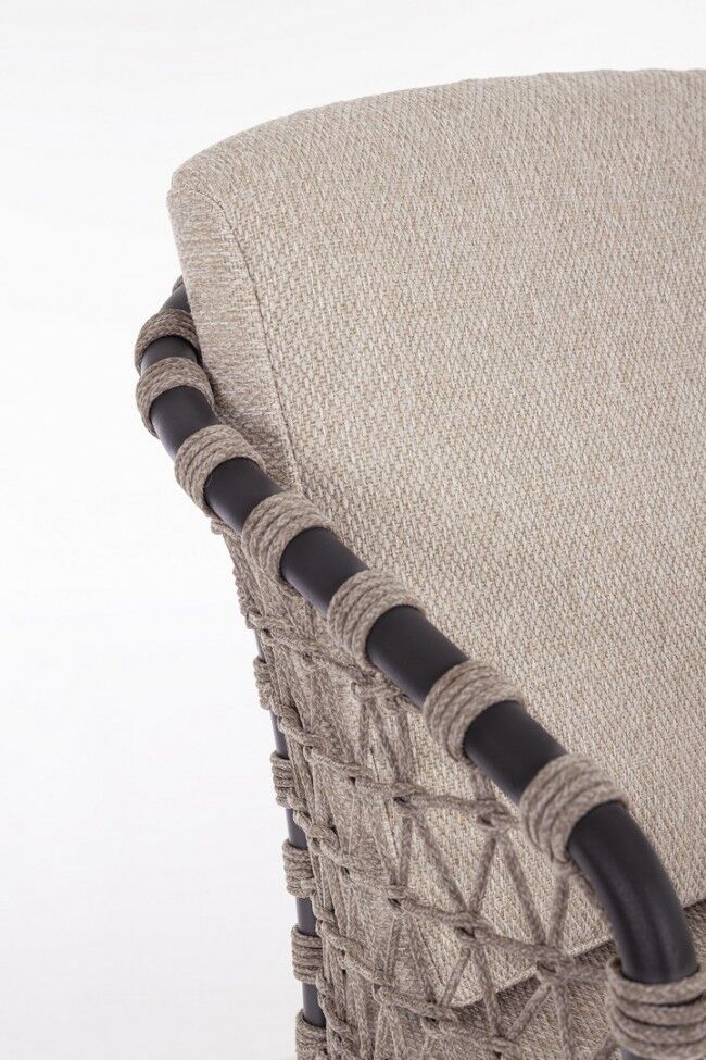 Vrtna fotelja EULARIA s jastucima u prirodnoj boji pijeska spaja eleganciju prirodnih materijala i čvrstu modernu konstrukciju. Okvir od aluminija s praškastim premazom i noge od masivnog tikovog drva osiguravaju stabilnost i dugotrajnost. Nasloni su ručno pleteni polipropilenskim užetom u toplim nijansama. Jastuci od tkanine Olefin (100 % polipropilen) otporni su na vremenske uvjete. Vrtna fotelja EULARIA savršeno se kombinira s ostalim proizvodima linije EULARIA.