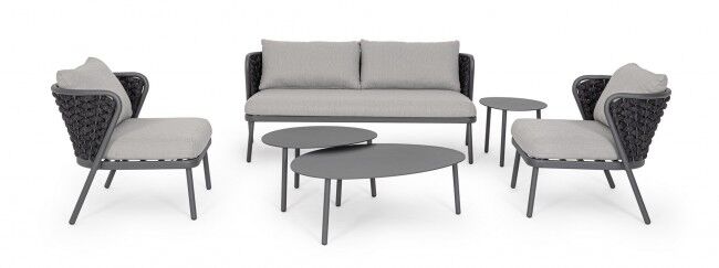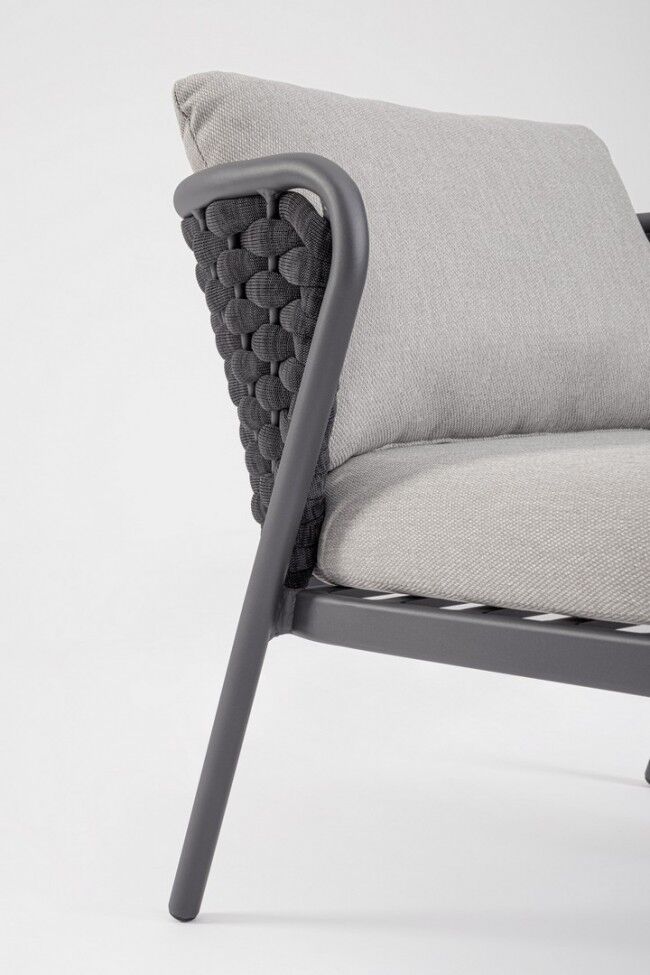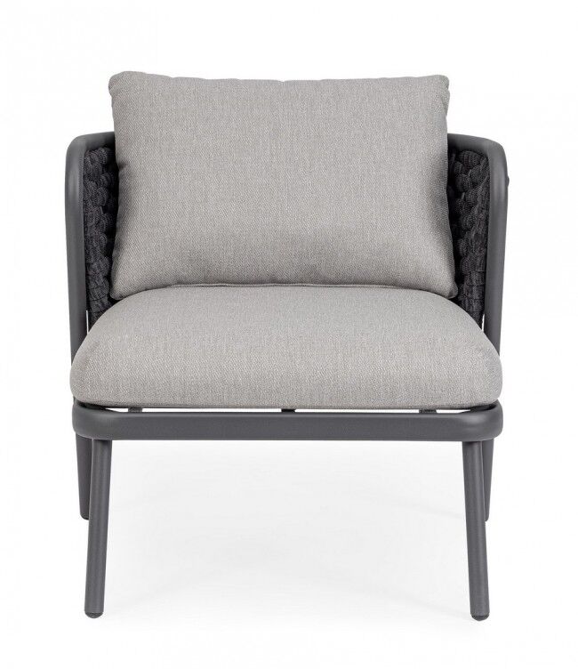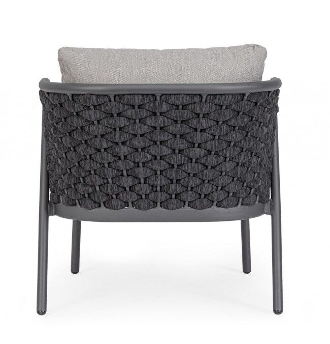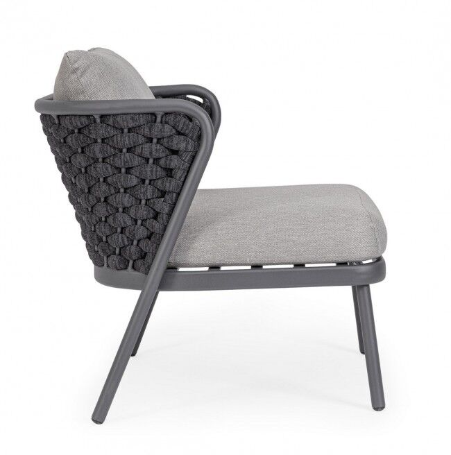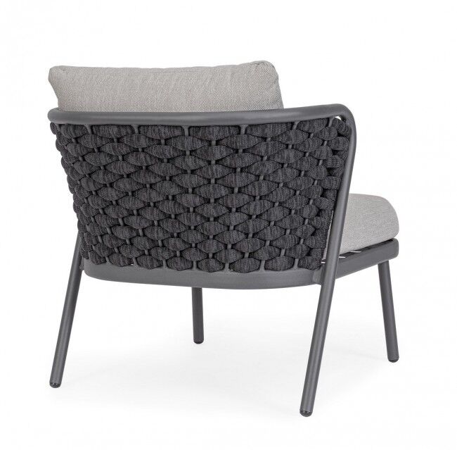Vrtna fotelja HARLOW antracit QS22/grafit s aluminijskom konstrukcijom, tkanim tekstilnim užetom i podstavljenim jastucima od vodoodbojne tkanine. Elegantna i udobna fotelja za terase, vrtove i balkone. Marka Bizzotto Homemotion. Minimalna narudžba 2 komada.