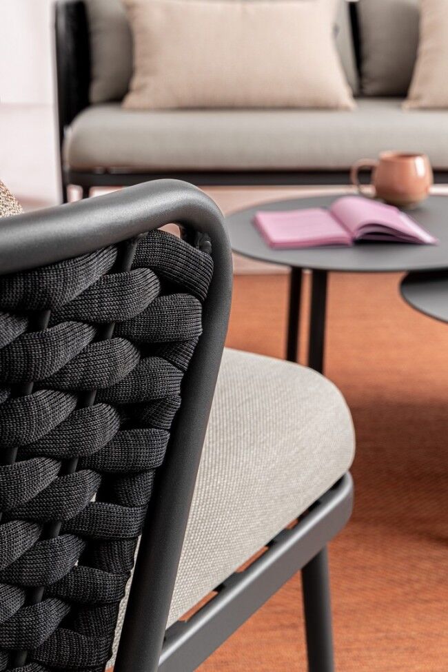 - Pleteni tekstil od Textilene konopa s nitritnom gumom : Naslon i bočne površine fotelje pleteni su visokokvalitetnim Textilene konopom koji sadrži nitritnu gumu, što osigurava izvrsnu izdržljivost i udobnost. Materijal je otporan na UV zrake, vremenske utjecaje i omogućuje prozračivanje.