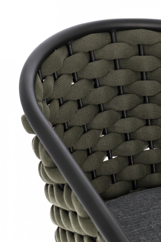Vrtna fotelja MARGALIDA antracit/zelena je elegantna i udobna stolica dizajnirana za vanjske prostore. Njegova aluminijska konstrukcija obložena prahom osigurava otpornost na vremenske uvjete i dugovječnost. Sjedalo i naslon pleteni su visokokvalitetnim polipropilenskim užetom, što daje moderan izgled i udobnost. Uključuje jastuk od meke tkanine koji je izdržljiv i jednostavan za čišćenje. Kombinacija boja antracit i zelene dodaje sofisticiran i moderan dodir vašem vrtu ili terasi. Dizajniran je za sklapanje, što olakšava spremanje i štedi prostor.