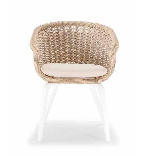 Vrtna fotelja MELROSE s jastukom. Aluminijski okvir, presvlaka od sintetičkog užeta Wintech, dimenzije 63 x 58 x 77 cm, visina sjedala 45 cm. Opremljena uklonjivim jastucima od olefinske tkanine. Težina: 7 kg. Minimalna narudžba: 4 komada. Idealno za moderno vanjsko okruženje.