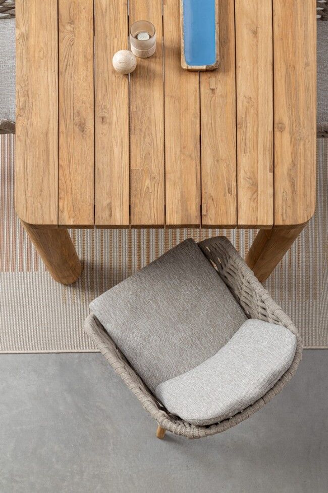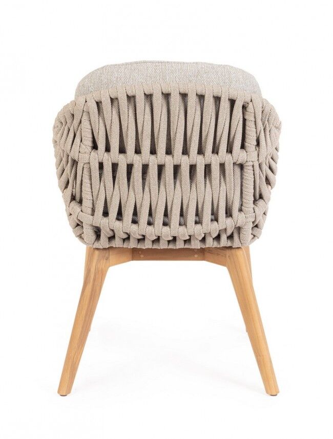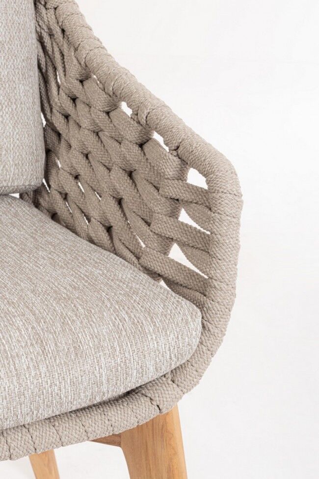 Vrtna fotelja TAMIRES BEIGE kombinira elegantan dizajn i izdržljive materijale. Njegova aluminijska struktura i noge od tikovine s polipropilenskim užetom i vodootporni olefinski jastuci otporni na sunce idealni su za vanjske prostore. Dimenzije: 61,5x70x82,5 cm.