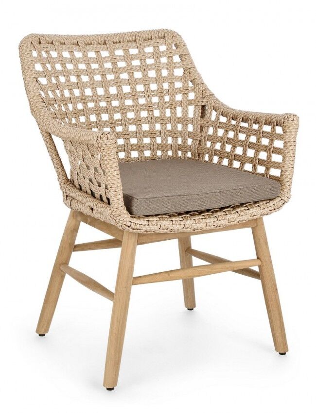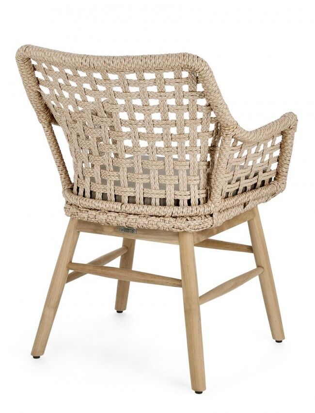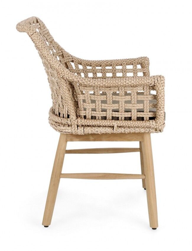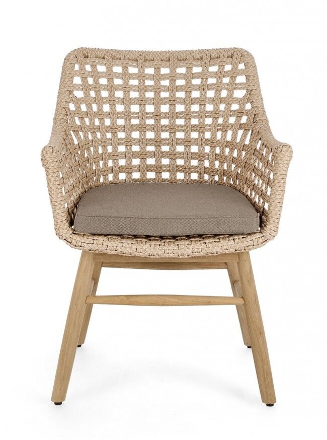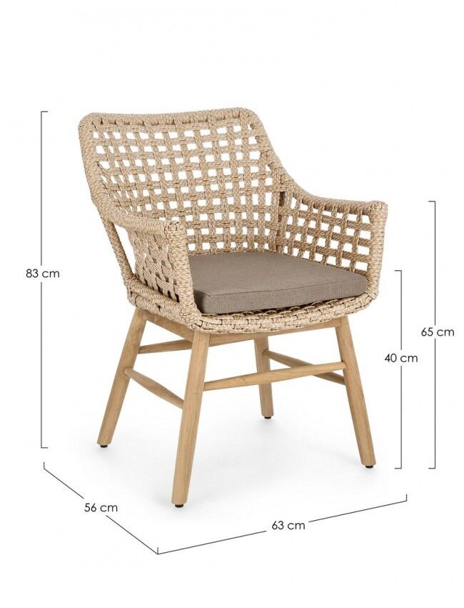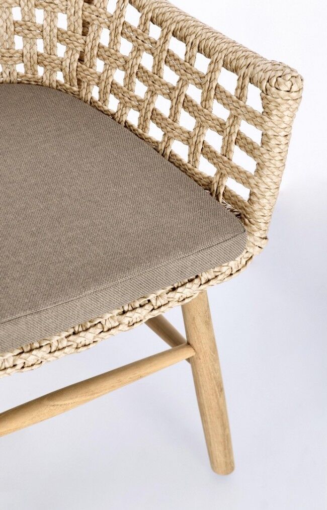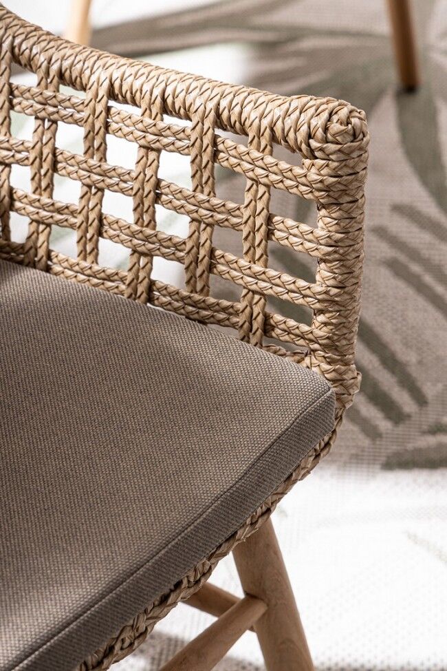 Vrtna fotelja WILSON u prirodnoj boji kombinira eleganciju i funkcionalnost, što je čini idealnom za svaki vanjski prostor. Sjedalo je izrađeno od aluminija premazanog poliesterskim prahom, što osigurava otpornost na vremenske uvjete. Pletenje od sintetičkih vlakana viro s originalnim tkanjem u pletenom uzorku (efekt kože) dodaje dašak luksuza. Jastuk za sjedenje je odvojiv i izrađen od tkanine sunproof olefin (100% polipropilen), koja je otporna na vremenske uvjete. Noge su od tikovine (SVLK certificiran drvo iz održivih izvora), što pridonosi stabilnosti i trajnosti. Vijci su od galvaniziranog čelika, a noge je potrebno sastaviti.