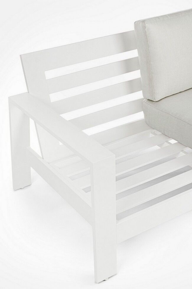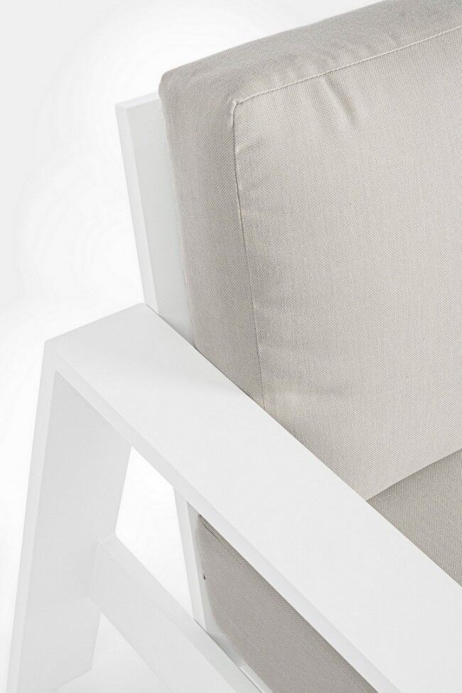 Vrtna garnitura BALTIC bijela YK11 je dizajnirana za moderan vanjski prostor koji kombinira udobnost, estetiku i trajnost. Garnitura ima čvrstu aluminijsku konstrukciju premazanu poliesterskim prahom u bijeloj boji, što osigurava otpornost na vremenske uvjete i dugotrajnost. Jastuci za sjedenje i naslon izrađeni su od hidroizolacijskog olefina (100% polipropilen), otporni su na vlagu i jednostavni za održavanje, jer su navlake odvojive.