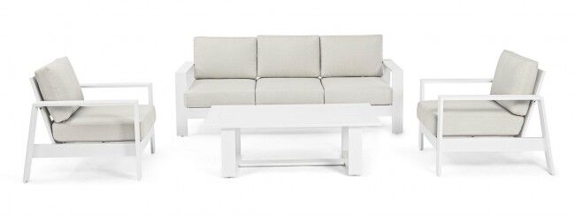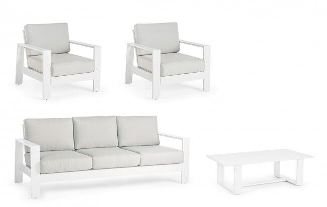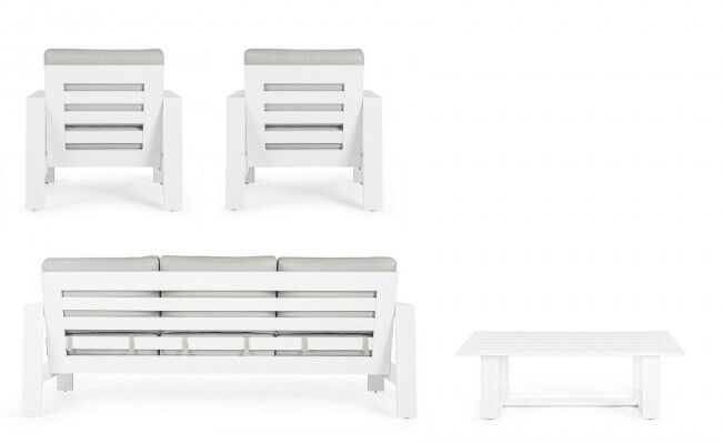 Vrtna garnitura BALTIC bijela YK11 s aluminijskom konstrukcijom premazanom poliesterskim prahom i jastucima od hidroizolacijskog olefina. Odvojive navlake, podesive nogice, trajnost i moderan dizajn.