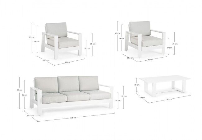 - Element B: 206 cm (širina) x 85,5 cm (dubina) x 83 cm (visina) x 39,5 cm (visina sjedišta) x 59 cm (visina naslona) x 76 cm (visina naslona za ruke)