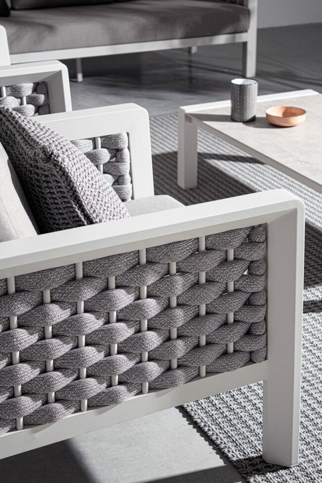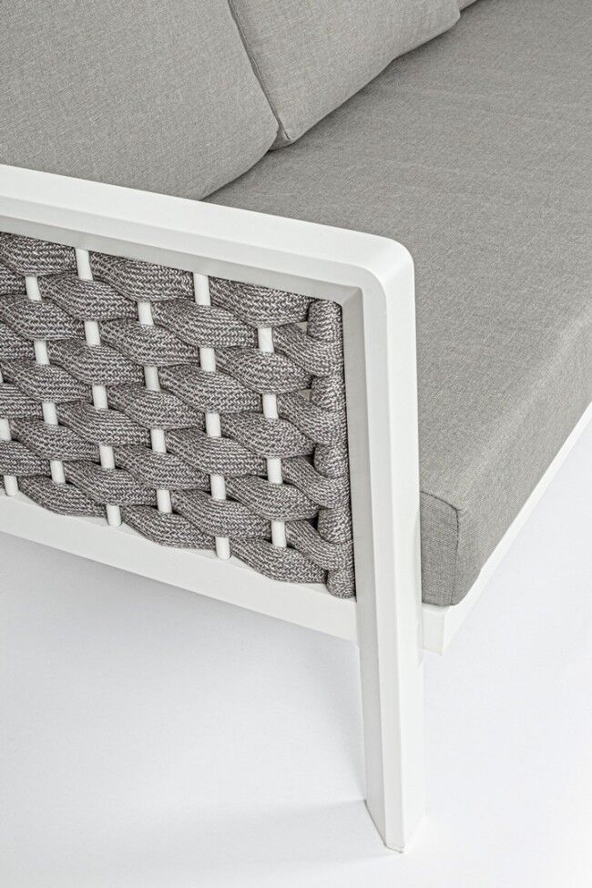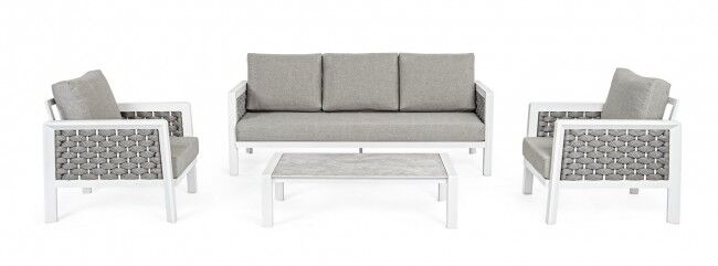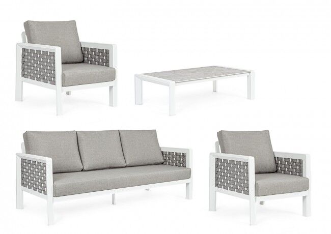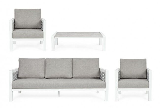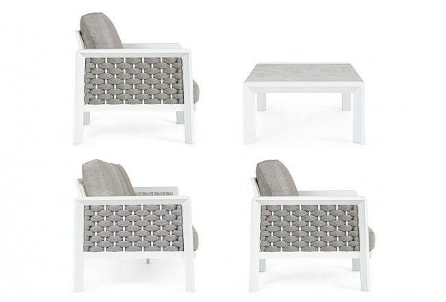 Vrtna garnitura OTAVIO bijeli WG20 s aluminijskom strukturom protkanom tetoronskom užadi i uklonjivim jastucima od olefinske tkanine. Stolić za kavu s keramičkom pločom.