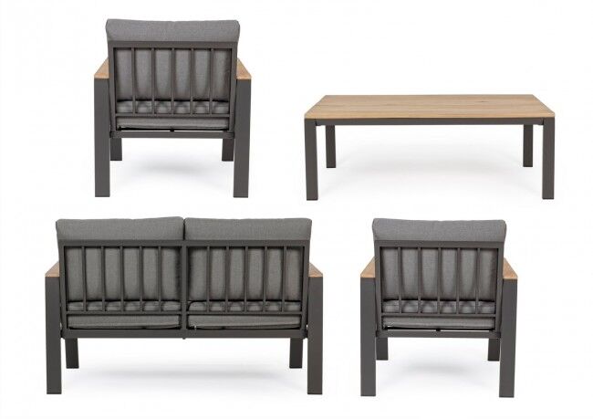 Vrtna garnitura SET4 BELMAR natural/anthracit je moderna garnitura za 4 osobe, izrađena od aluminija s praškastim premazom , s naslonima za leđa i pločom stola u drvenom izgledu te uklonjivim jastucima od olefin tkanine. Izdržljiv i otporan na vremenske uvjete, idealan za uživanje na otvorenom.