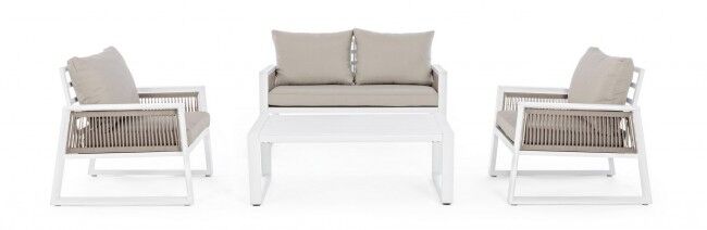 Vrtna garnitura SET4 CAPTIVA bijela LH30 s aluminijskom konstrukcijom i tekstilnim sjedalom . Uključuje uklonjive vodootporne jastuke od tkanog poliestera , podesive noge i moderan dizajn s tekstilnim užadima . Pogodan za 4 osobe , idealan za uživanje i opuštanje na otvorenom.