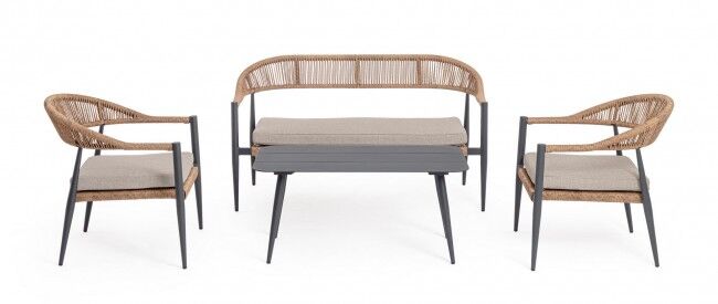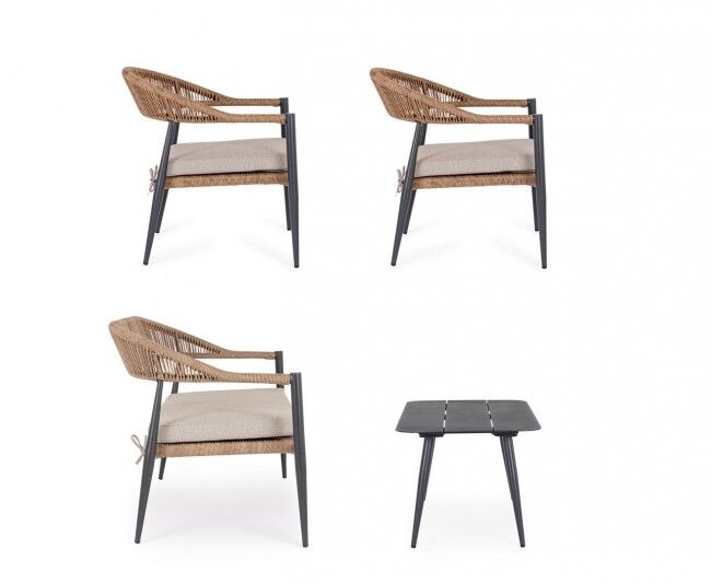 Vrtna garnitura SET4 JANDIA ANTRACIT/NATURAL s jastucima nudi kombinaciju udobnosti, suvremenog dizajna i rustikalne elegancije. Izrađena od aluminijske konstrukcije s praškastim premazom i prepletena sintetičkim vlaknima prirodnog izgleda, savršena je za vanjske prostore – terase, hotele ili privatne vrtove. Jastuci su izrađeni od vodootpornog poliestera s perivim navlakama.