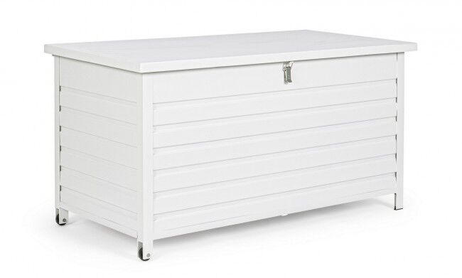 Vrtna kutija ATLANTIC u bijeloj boji, od aluminija s plinskim amortizerima i kotačima. Elegantan i praktičan dodatak za vanjski prostor.