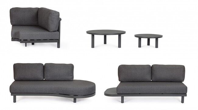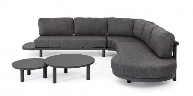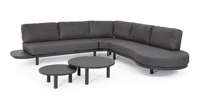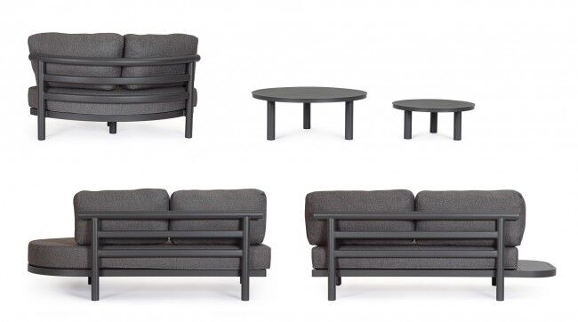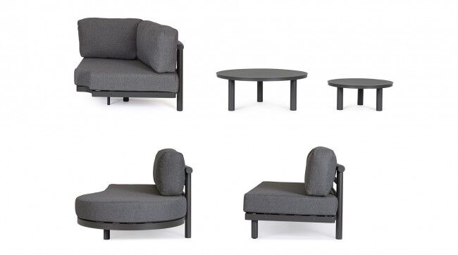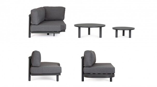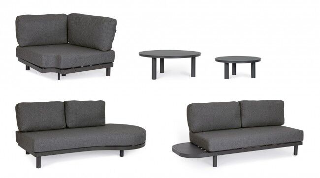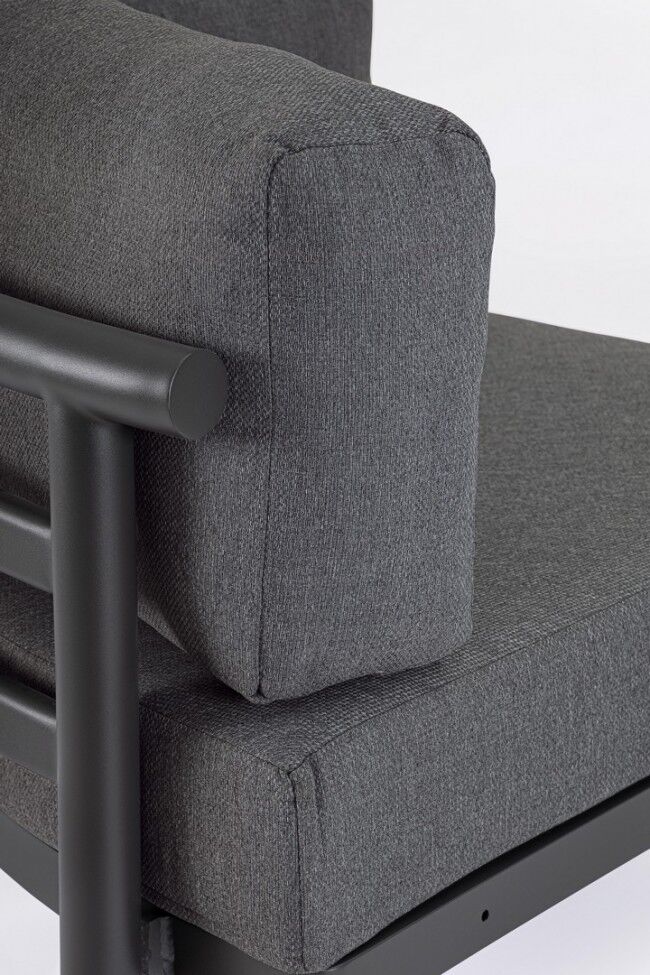 Jastuci u istoj boji izrađeni su od Olefin tkanine (100 % polipropilen), s vodoodbojnim svojstvima i skidivim navlakama. U kompletu dolaze i antracit stolići s podesivim nogicama koji upotpunjuju luksuzan dojam.